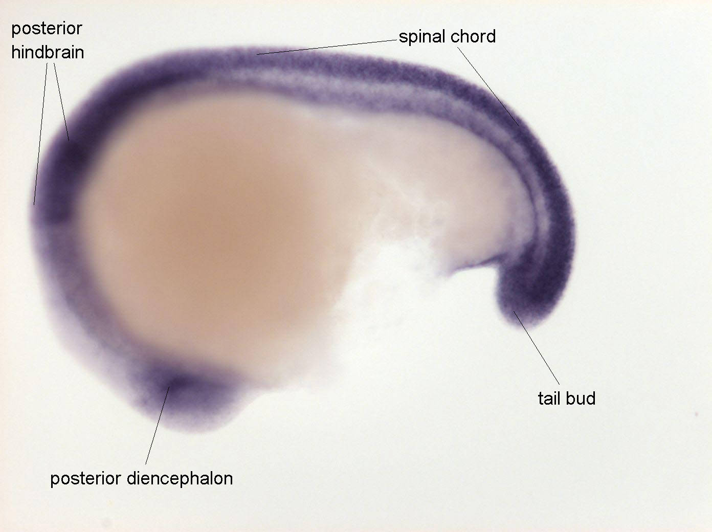 Fig. 3 Expressed in posterior diencephalon, in hindbrain (stronger in rhombomere 5 and 6), in spinal chord in tail bud and in ventral mesenchyme.