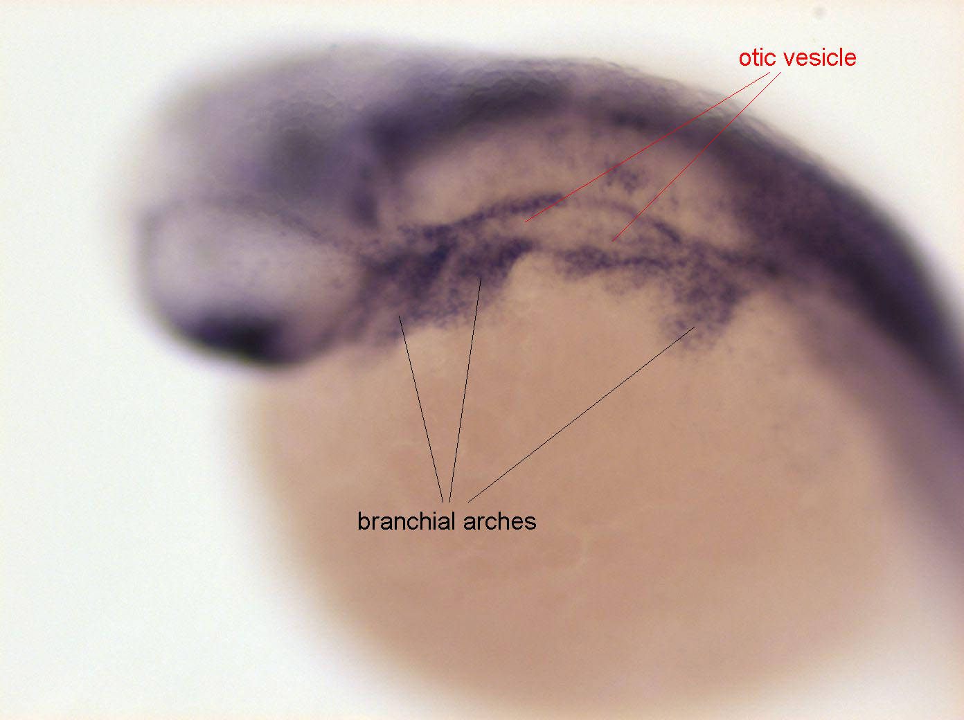 Fig. 4 Expressed in forebrain ventricular zone, in ventral part of the retina, in one diencephalic nucleus, in posterior tegmentum, branchial arches anterior spinal chord and posterior hindbrain, in hindbrain nuclei, in ventral and dorsal part of the spinal chord and in myotomes
