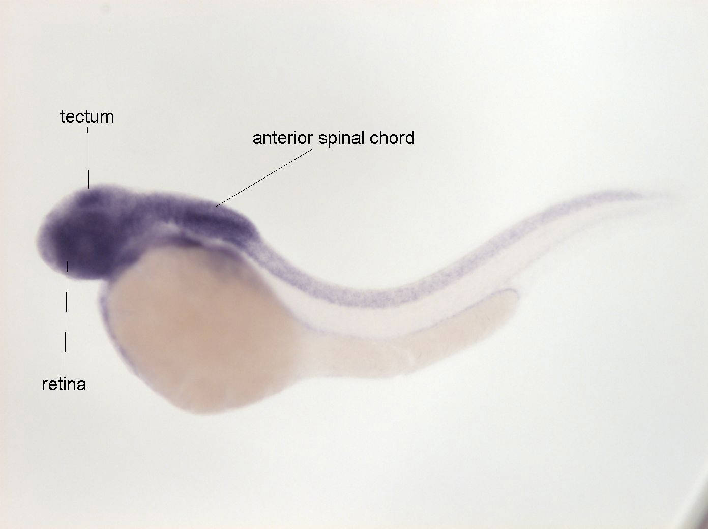 Fig. 4 Expressed in central nervous system except in ventricular zone (more in anterior diencephalon, tectum hindbrain and anterior spinal chord), in retina, branchial arches and pectoral fin bud.