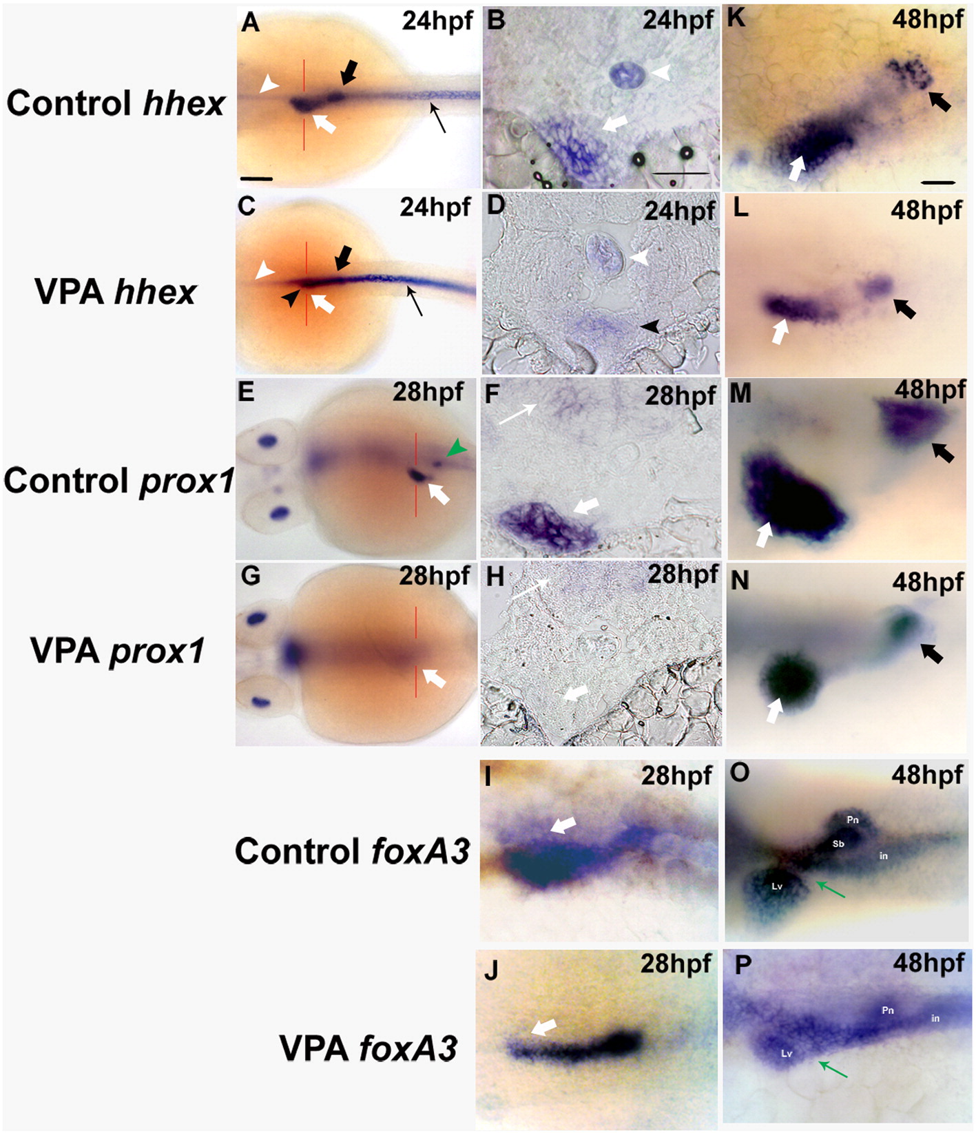 Fig. 4 HDACs are required for early liver development. Expressions of early liver markers were analyzed by WISH in WT and VPA-treated embryos including hhex (A–D, K, L), prox1 (E–H, M, N) and foxa3 (I, J, O, P). All panels are whole mount pictures except panels B, D, F and H which are tissue sections corresponding to panels A, C, E and G, respectively, with section planes indicated by red lines. In all panels, liver is indicated by a thick white arrow while pancreas is indicated by a thick black arrow. Expression of hhex was completely abolished in liver and pancreatic islet (C vs. A) at 24 hpf in VPA-treated embryos while its expression in intermediate cell mass (ICM) (A vs. C, thin black arrow) remains unaffected. Note that panels A and C were focused on different focal planes with panel A focusing on the liver region while panel C focusing on the more posterior ICM. White arrowhead indicates hhex expression in notochord (A–D) and black arrowhead in panels C and D refers to hhex expression in anterior endoderm. At 48 hpf, hhex expression in liver and pancreatic islet was significantly reduced (K vs. L). prox1 expression in liver region was absent in treated embryos at 28–30 hpf (E vs. G, F vs. H) while its expression was greatly reduced at 48 hpf (M vs. N). The green arrowhead in panel E indicates interregnal gland which also expresses prox1 at this stage. Initial endoderm thickening at liver region was absent in treated embryos at 28–30 hpf as judged by foxa3 expression (I vs. J, white arrow). At 48 hpf, a slightly small and compressed liver was observed in VPA-treated embryos while the hepatic duct was still not well formed (O vs. P, thin green arrow). All imagines are dorsal view, anterior to the left. Scale bar represents 100 μm in panels A, C, E, G, I and J; 20 μm in panels B, D, F and H; 50 μm in panels K–P. Lv: liver; Pn: pancreas; in: intestine; Sb: swim bladder.