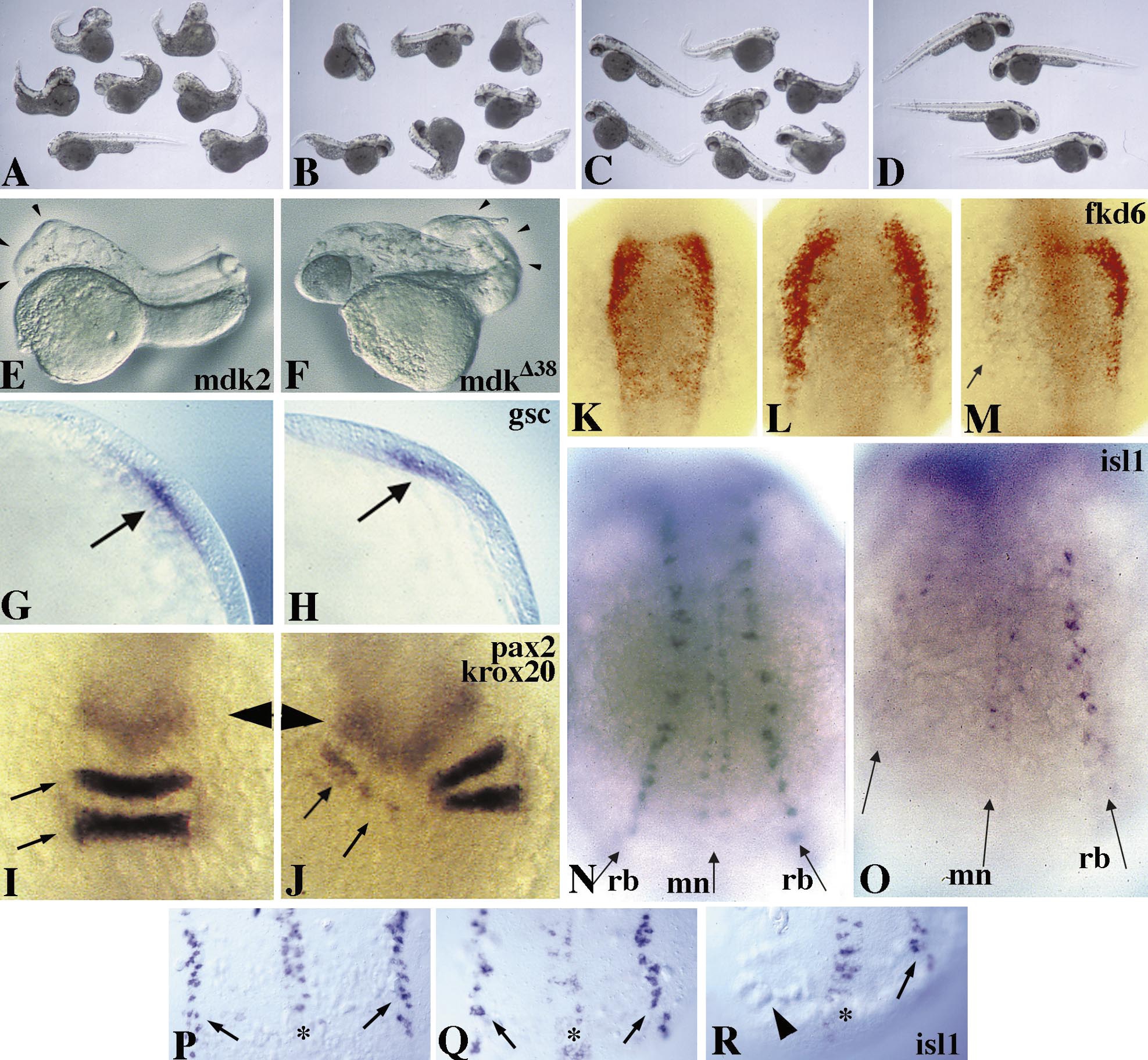 Fig. 4 Repression of posterior neural fates by the dominant interfering mdk2 variant mdkΔ38. (A to D) Coexpression of mdkΔ38 rescues head deficiencies induced by ectopic mdk2 expression. (A) Embryos exhibiting a strong posteriorized phenotype at 48 h after injection with 110 pg mdk2 and 330 pg prolactin RNAs. Note that ectopic mdk2 leads to specific repression of head and eye structures and to some curved tails. (B) Partial rescue of head deficiencies by co-injection of 110 pg mdk2, 220 pg mkΔ38, and 110 pg prolactin RNAs. (C) Greater rescue of head deficiencies by co-injection of 110 pg mdk2 and 330 pg mkΔ38. The majority of head structures appear indistinguishable from those of uninjected control embryos (D). The posterior defects observed are likely due to mdkΔ38 interfering with endogenous mdk2 function. (E, F) 24-h embryos injected with 200 pg wild-type mdk2 (E) and mdkΔ38 (F). Note anterior truncation resulting from gain of function (E, arrowheads) and posterior deficiencies resulting from loss of function (F, arrowheads). (G) Lateral view of gsc expression in an uninjected embryo at 80% epiboly. (H) gsc expression (arrow) is unaffected in mdkΔ38-injected embryos. (I–O) 12-h embryos, dorsal view, anterior to the top. (I) pax2 (arrowhead) and krox20 (arrows) expression in an uninjected embryo. (J) Repression of krox20 expression in rhombomeres 3 and 5 of an embryo unilaterally injected with mdkΔ38. Expression of pax2 at MHB appears normal compared to I. (K) fkd6 staining (red) in an uninjected embryo. (L) Expansion of the fkd6-positive neural crest domain in mdk2-injected embryo. (M) Repression of fkd6 by mdkΔ38 in one half of a unilaterally injected embryo (arrow). (N–R) Ectopic mdkΔ38 expression blocks formation of posterior moto- and sensory neurons. (N) isl1 expression in Rohon–Beard sensory neurons (rb) and motoneurons (mn) of an uninjected embryo at 12 hpf. (O) Unilateral lack of both neural fates in an embryo unilaterally injected with mdkΔ38. (P–R) Dorsal view of 10-h embryos. (P) isl1 expression in an uninjected embryo. (Q) Primary neurons appear unaffected in a mdk2-injected embryo. (R) Note unilateral absence of sensory neurons (arrowhead) in mdkΔ38-injected embryo.
