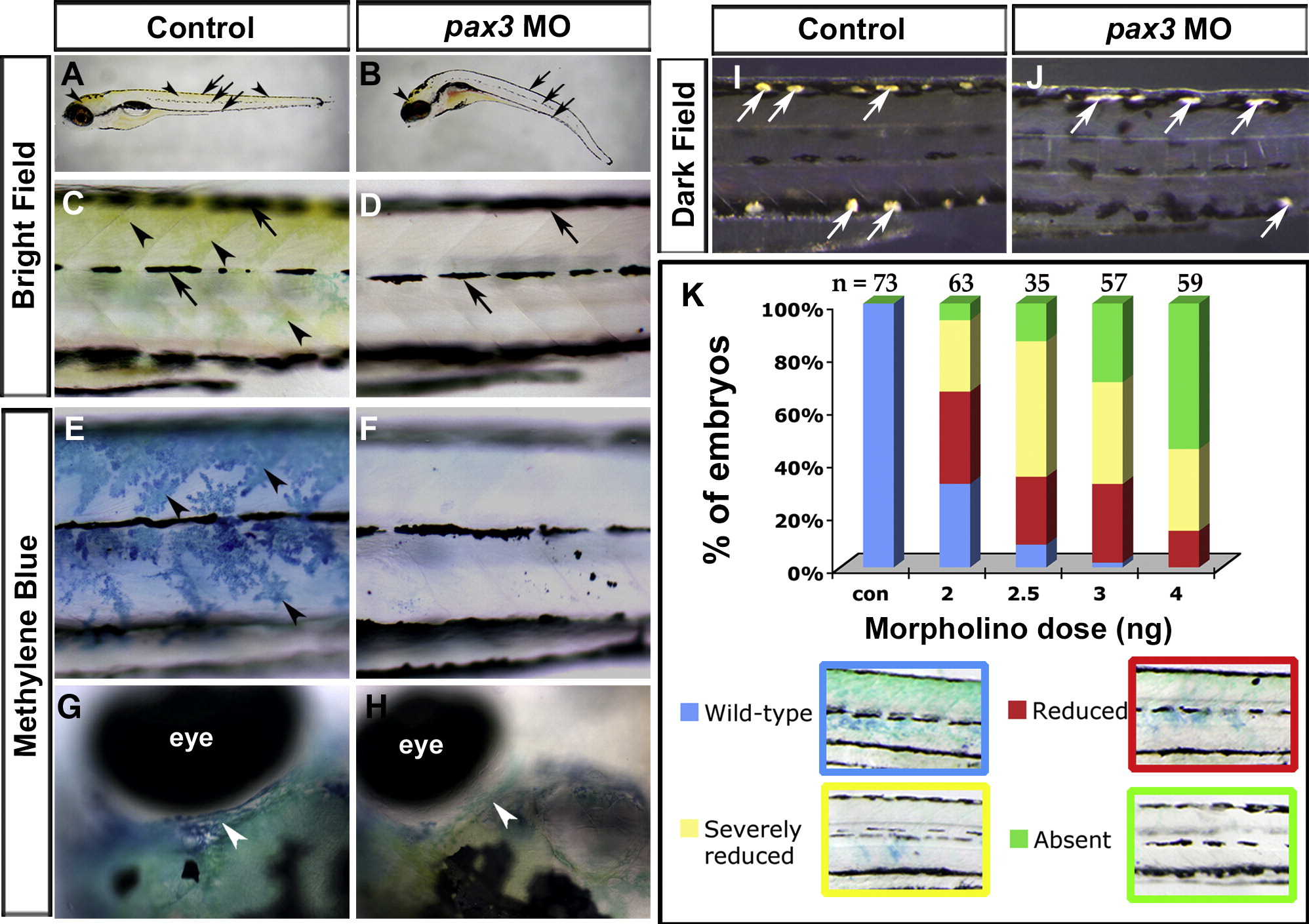 Fig. 2 Pax3 knockdown blocks terminal differentiation of trunk xanthophores whilst other pigment cell types differentiate. Live control (A, C, E, G, I) or pax3 MO-injected (B, D, F, H, J) zebrafish larvae showing yellow xanthophore pigmentation in brightfield images (A–D), stained with methylene blue to reveal pterinosomes (E–H) or in darkfield to reveal iridophores (I, J). Lateral views (A–F, I, J) are anterior to left and dorsal to top. Dorsal views of head region (G, H) are anterior to left and lateral to top. (A–D) At 5 dpf, yellow xanthophore pigmentation is visible on the dorsal head and trunk (arrowheads). Embryonic melanophores are arranged in stripes (arrows). In pax3 morphants, no yellow xanthophore pigmentation is visible in the trunk and is reduced in the dorsal head (B, arrowhead), whereas embryonic melanophore stripes are still present and located correctly (B, D, arrows). (E–H) At 5 dpf, blue pterinosomes (arrowheads) coincide with xanthophore locations in dorsal and posterior regions overlying epaxial and hypaxial somite in the trunk (E) and above the eye in the head (G, white arrowhead). In pax3 morphants, pterinosome stain is absent from the trunk (F) and reduced in the head (H, arrowhead). (I, J) At 6 dpf, shiny iridophore pigment cells (white arrows) have begun to differentiate and are located at the dorsal and ventral larval melanophore stripes (I). Overlying xanthophores give the iridophores a yellow tint. In pax3 morphants, iridophores differentiate in both dorsal and ventral positions but appear white due to the lack of overlying xanthophores (J). (K) Severity of methylene blue-stained xanthophore phenotype in trunk is dependent on dose of pax3 MO. Overall reduction in trunk xanthophores (reduced) was distinguished from complete absence in most of the trunk (severely reduced). Number of embryos analysed (n) are given above columns.