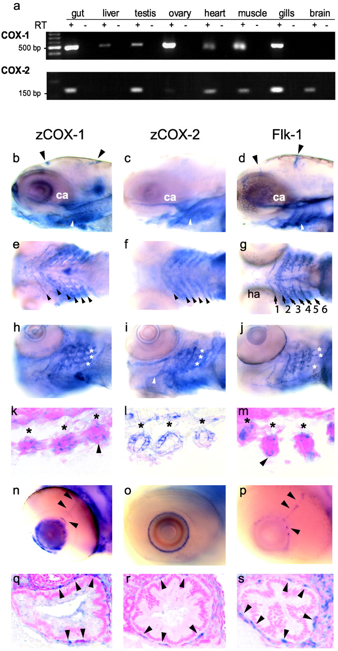 Fig. 4 (a) Analysis of zCOX-1 and zCOX-2 transcript expression in adult zebrafish. We assessed constitutive zCOX isoform expression in adult zebrafish by reverse transcriptase-PCR using total RNA from freshly dissected adult organs. PCR products (500 bp and 162 bp) and the corresponding negative controls were visualized by agarose gel-electrophoresis. Expression of zCOX-1 (b, e, h, k, n, and q), zCOX-2 (c, f, i, l, o, and r), and flk-1 (d, g, j, m, p, and s) by whole-mount in situ hybridization in zebrafish larvae at 96 hpf. zCOX-1 (b), zCOX-2 (c), and the endothelial marker flk-1 (d) are expressed in the carotid artery (ca) and the pharyngeal arches (white arrow) (lateral view). zCOX-1 (b) and flk-1 (d) are also present in cranial arteries (arrowheads). (e-g) Ventral views showing expression in the pharyngeal arches (arrowheads). While flk-1 staining (g) highlights the vasculature in the center of the arches [arch arteries 1 and 2 (opercular artery); 3-6,ha, hypobranchial artery (35)], zCOX-1 (e) and zCOX-2 (f) appear to be expressed in more peripheral structures of the arches. (h-j) Oblique ventral views. zCOX-1 (h), zCOX-2 (i), and flk-1 (j) colocalize and are expressed within sprouting gill arteries (*) that are apparent as protrusions at the caudal surface of arch arteries 3-6. (k-m) Histological cross sections through these vessels (*, section rotated by 90°) show flk-1 (m) expression in endothelial cells. zCOX-2 is highly expressed in the vessel wall of the sprouting gill vasculature (l). zCOX-1 expression is less intense and appears to be present in both endothelial and wall structures (k). (n-p) Endothelial expression of zCOX-1 was seen the ciliary arteries of the eye (n, arrowheads), which were also visible in flk-1 (p), but not in zCOX-2-stained embryos (o). zCOX-1 and zCOX-2 were both differentially expressed in other structures of the developing eye (n and o). (q-s) All three genes were expressed in the vasculature of the intestine. Endothelial cells are highlighted by arrowheads. (Magnifications: (b-j) x200, (k-m and q-s) x630, n-p) x400.)