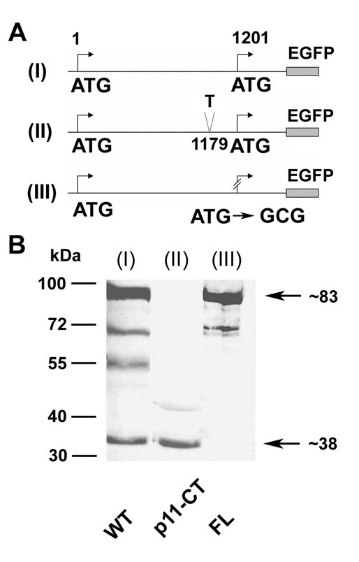 Fig. 3 A part of the carboxy-terminal domain of Cx55.5 is translated from an internal translation site within the coding region of Cx55.5: Schematic view of wild type full length WT (I), frameshift mutated (position 1179) full length, p11-CT (II), and in-frame ATG replaced by GCG (position 1201) of full length Cx55.5 construct, FL (III). The frameshift mutation (II) leads to a premature stop codon at nucleotide position 1227. The carboxy-terminus of Cx55.5 is truncated by 90 amino acids and 15 amino acids are altered after the added "T" at nucleotide position 1179. B) Western blot of transiently transfected N2A cells: (lane I) Wild type (WT), (lane II) frameshift mutated p11-CT, and (lane III) ATG replaced by GCG of full length Cx55.5 (FL).