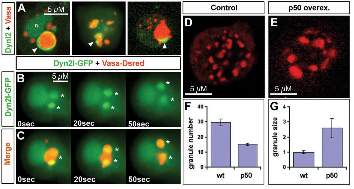 Fig. 6 Dynein localize to germ cell granules and is involved in granule fragmentation. A) DynL2-GFP is localized to nucleus, cytoplasm and to germ cell granules. Granule DynL2-GFP localization patterns are diverse, ranging from ring-like structures around large granules (left panel, arrowhead, nucleus is depicted by n), dots within the granules (arrowhead, middle panel) or accumulations can also be observed on the periphery of such structures (arrowhead, right panel). Interphase cells where analyzed in 6 to 10 hpf embryos. Note that Vasa-dsRed and DynL2-GFP colocalization preferentially occurs in the largest granule of the cell. B) Germ cells of 9 hpf embryos expressing DynL2-GFP were analyzed in vivo by epifluorescence microscopy. DynL2-GFP is localized to a large germ cell granule where two centers of high concentration are observed preceding the division of the granule (asterisks in B,C). C) Merge of B together with Vasa-dsRed to visualize the granules. D) Immunostaining of control germ cells of 24 hpf embryos showing the normal number (shown graphically in F) and size (shown graphically in G) of Vasa expressing granules n = 33 cells and 191 granules (G). Dynein inhibition in germ cells of 24 hpf embryos by p50 overexpression reduces the number of granules per germ cell while the size of germ cell granules increases. n = 116 cells and 154 granules (E,G). TTtest for F: p < 1E-8. TTest for G: p < 1E-14.