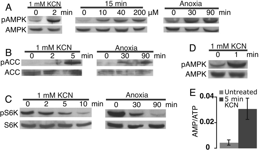 Fig. 5 The AMP-activated protein kinase (AMPK) pathway is activated by the inhibition of oxidative phosphorylation in zebrafish embryos. A: Immunoblot analysis of AMPK phosphorylation before and after 2 min in KCN, with increasing KCN doses, or with increasing time in anoxia. B: Phosphorylation of Acetyl-CoA Carboxylase (ACC) with time in KCN or anoxia. C: Phosphorylation of p70-S6 Kinase (S6K) in KCN or anoxia. D: Seventy-two hour postfertilization (hpf) embryos were incubated in KCN and the timing of AMPK phosphorylation was assessed. E: Change in the AMP/ATP ratio after a 5 min inhibition of oxidative phosphorylation as described in the Experimental Procedures section. Error bars are ±SD. All experiments used 24 hpf embryos.