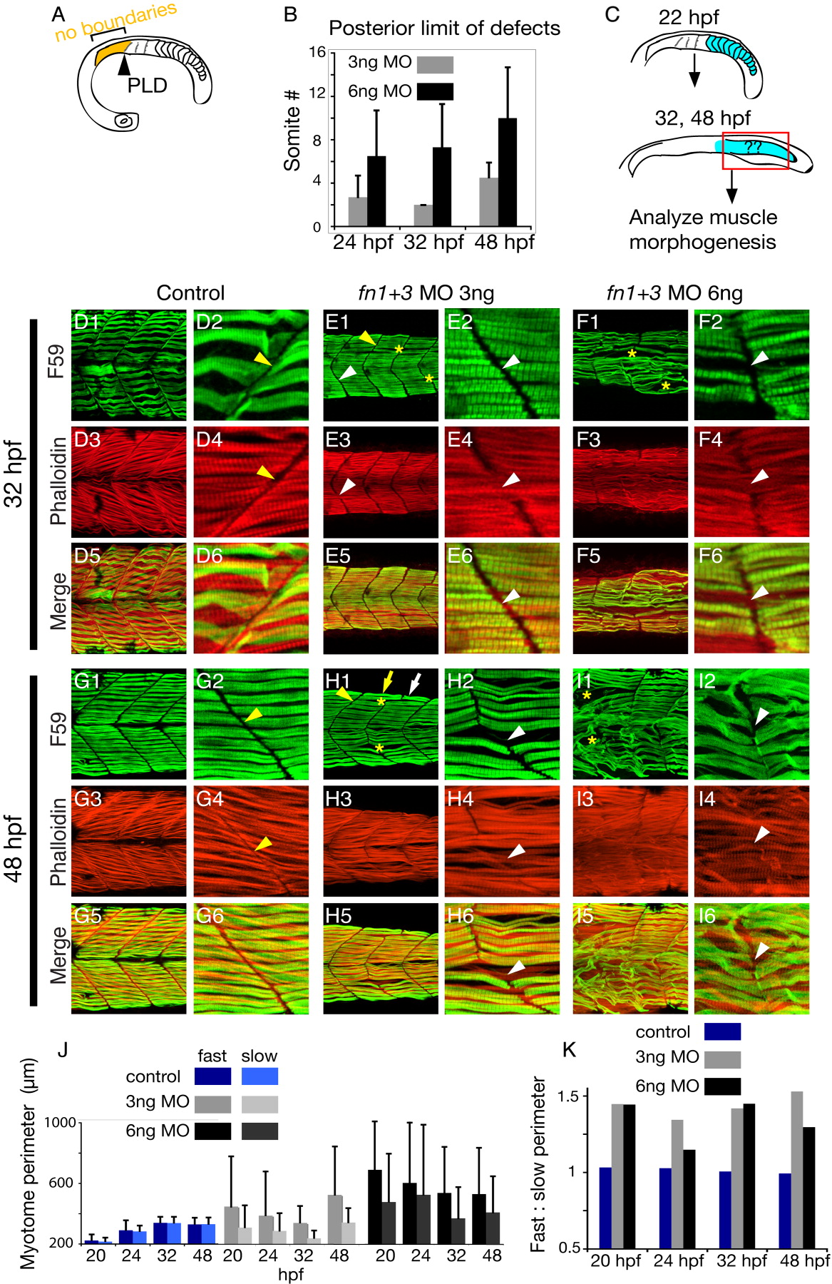 Fig. 2 Uncoupling of fast- and slow-twitch muscle morphogenesis in fn morphants. A: Cartoon showing the qualitative definition of the posterior limit of defects (PLD) that was used in this study. The PLD was considered to be the anterior most somite at which segmentally reiterated somite boundaries (albeit disrupted) were observed. B: Graph depicting posterior limit of boundary defects of embryos injected with 3- or 6-ng fn1+3 MOs. Morphant myotome defects are examined at three time points: 24 (n = 11 embryos), 32 (n = 20 embryos), and 48 (n = 13 embryos) hours postfertilization (hpf). Average PLD ± standard deviation is shown. C: Cartoon depicting the region of analysis in the embryo. Because posterior somites form in 3-ng fn1+3 morphant embryos, subsequent muscle morphogenesis was analyzed only in the posterior region (> somite 8) of 32 and 48 hpf embryos. D-I: Side views, anterior left, dorsal top, of embryos stained with F59 (green) to visualize heavy chain myosin (slow-twitch muscle) and phalloidin (red) denoting filamentous actin (fast-twitch muscle). D,G: In control embryos, MTJ boundaries are observed in slow-twitch and fast-twitch muscle (D, G, yellow arrowheads). When the two domains are overlaid, it is clear that the fast-twitch domain mirrors the slow-twitch domain (D5, D6). At 48 hpf, control embryos exhibit similar muscle morphology, with clear slow- and fast-twitch myotome boundaries and the two domains line up (G5, G6). E,H: Uncoupling of MTJ boundaries in the fast-and slow-twitch muscle domains in 3-ng fn1+3 morphant embryos. Although there are gaps in the slow-twitch domain (E1, H1, yellow asterisks), MTJ boundaries are readily apparent (yellow arrowheads). Fast-twitch fibers often cross the myotome boundary denoted by slow fibers (E4, H4, white arrowheads). This uncoupling of fast-twitch and slow-twitch morphogenesis is readily apparent when the images are overlaid (E6, H6, white arrowheads). F,I: Embryos injected with 6-ng fn1+3 MOs display more severe disruptions of MTJ boundaries, fiber morphology, and uncoupling of MTJ boundaries in the fast-twitch and slow-twitch muscle domains. J: Graph showing fast-twitch fiber and slow-twitch segment perimeters through time. In control embryos, fast-twitch and slow-twitch segment domains are approximately the same size (n = 165 myotomes). In contrast, fast and slow-twitch segment domains in fn1+3 morphant embryo are more variable (n = 126 3-ng fn morphant myotomes and n = 152 6-ng fn morphant myotomes). The trend toward a larger fast-twitch domain in fn1+3 morphant embryos reflects the uncoupling of fast-twitch and slow-twitch muscle morphogenesis. K: Graph depicting ratio of fast-twitch to slow-twitch muscle domain segment perimeter through time. The ratio was obtained by dividing the average fast-twitch myotome perimeter by the average slow-twitch myotome perimeter. There is approximately a 1:1 ratio of fast to slow muscle segment perimeters in control embryos. This ratio is increased in fn1+3 morphant embryos, indicating that fast-twitch muscle domains are larger than the corresponding slow-twitch muscle domains.