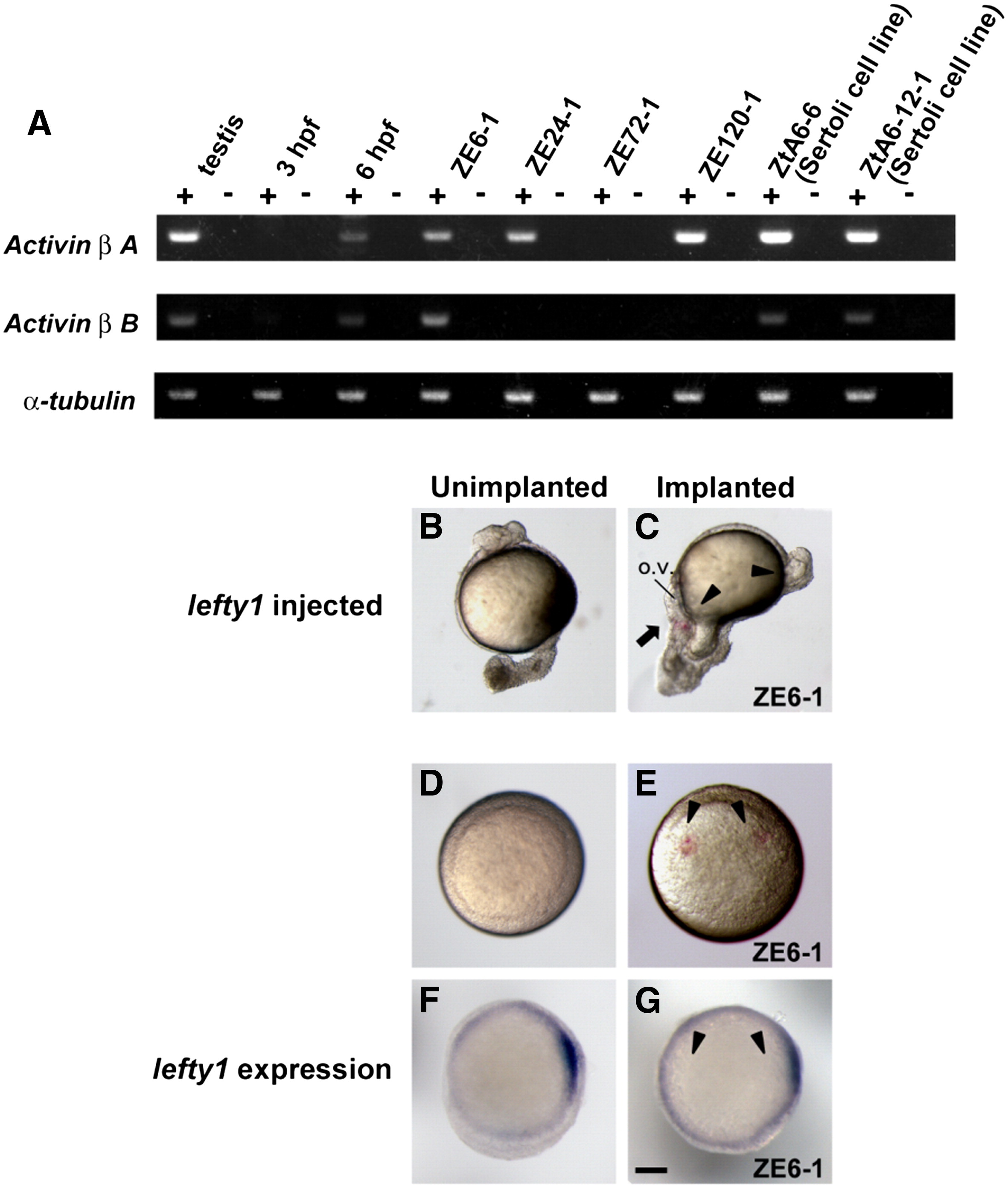 Fig. 6 Induction of the dorsal organizer is unrelated to Activin signaling. (A) Expression of activin in each cell line by RT-PCR. activinβA was detected in the ZE6-1, ZE24-1, ZE120-1 cell lines, and Sertoli cell lines (ZtA6-6, ZtA6-12-1) and activinβB was detected in the ZE6-1 cell line and Sertoli cell lines (ZtA6-6, ZtA6-12-1). (B, D, F) Unimplanted; (C, E, G) ZE6-1 implanted embryos. (B, C) Embryos injected with lefty1. Secondary axis induced in the lefty1-injected embryos (C; 18 of 19 embryos, ZE6-1). (F, G) Whole-mount in situ hybridization for lefty1. We observed no ectopic expression of lefty1 in implanted embryos (G; n = 23). (B, C) Lateral views at 24 hpf. (D–G) Animal pole views at 6 hpf. e, eye of secondary axis; o.v., otic vesicle of secondary axis; t, tail of secondary axis. Arrowhead indicates the cell implants. The large arrows in G indicate the secondary axis. Scale bar, 100 μm.
