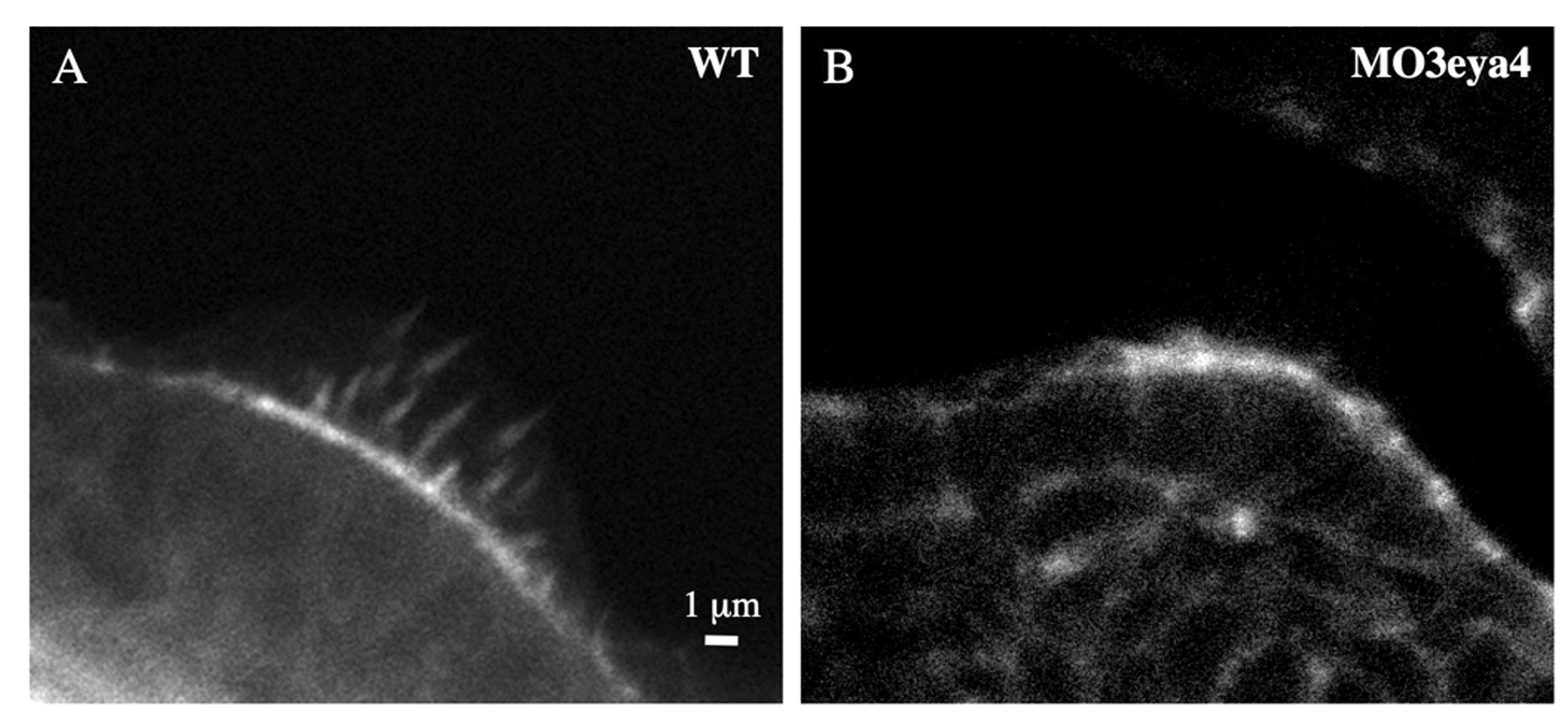 Fig. 4 Compromised hair cell development eya4 morphant fish. (A) At 72 hpf the ampulla of the posterior cristae of wild-type fish (n=10) have delicate hair cell stereocilia (stained with FITC-labeled phalloidin) that appear as spikes. (B) Stereocilia in hair cells of eya4 morphant fish (n=12) are dysmorphic and reduced in number.