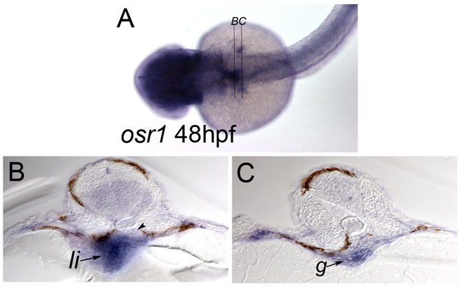 Fig. S1 osr1 expression in endodermal organs at 48 hpf. (A) Expression of osr1 mRNA in whole mount at 48 hpf, dorsal view. Lines represent plane of section in B, C. (B) Histological section just anterior to the fin bud shows osr1 expression in the forming liver (li). Arrowhead indicates the forming glomerulus, which is negative for osr1. (C) Histological section at the level of the fin shows osr1 expression in the gut (g).