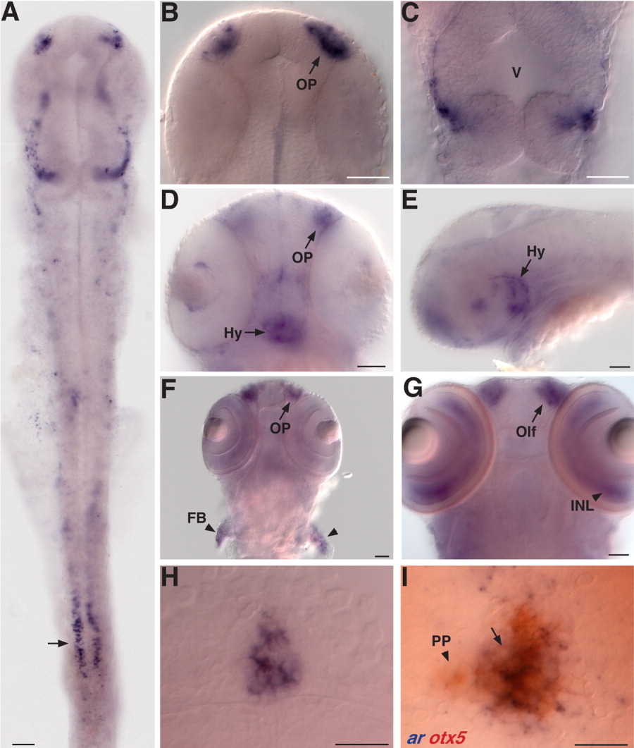 Fig. 2 Expression of the ar gene in the embryonic brain. A: Overview of expression at 1 day (d). Arrow indicates expression in pronephros, detailed in Figure 3. B,C: Higher magnification images of expression in olfactory placodes (OP) and midbrain. V, midbrain ventricle. D,E: Expression in the presumptive hypothalamus (Hy) appears at 2 d. F: OP expression persists at 3 d and transcripts are detected in the pectoral fin buds (FB, arrowhead). G: Robust expression in the maturing olfactory organ (Olf, arrow) and the inner nuclear layer of the retina (INL, arrowhead) by 5 d. H: High magnification image of expression in the dorsal diencephalon at 3 d. I: Double-label in situ hybridization shows ar gene expression colocalizes with transcripts of otx5 (red), a gene expressed in the pineal complex (arrow). ar is not expressed in the parapineal organ (PP, arrow head). All panels are dorsal views, anterior to the top except E, lateral view, anterior to the left. Scale bars = 50 μm in A-G, 25 μm in H,I.