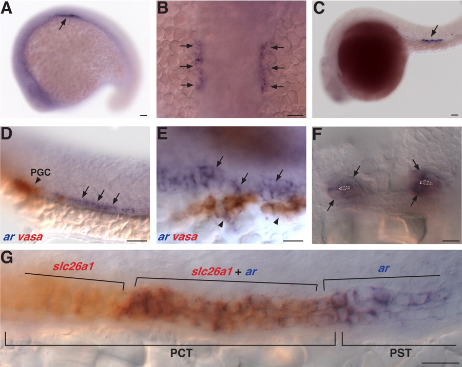 Fig. 3 Expression of the ar gene in the embryonic pronephros. A,B: ar transcripts are detected in a bilateral row of cells (arrows) lateral to the somites at the 18 somite stage. C: ar expression is displaced posteriorly (arrow) by 24 hours (h). D,E: Double-label in situ hybridization of ar (blue, arrows) and vasa (red, arrow heads), a marker of primordial germ cells, at 24 h. E: Close association between vasa and ar expressing cells. F: Coronal section showing ar expression (arrows) in cells that form pronephric tubules at 24 h. Tubule lumen outlined in white, dorsal to the top. G: A subset of cells in the proximal convoluted tubule (PCT) express both ar (blue) and slc26a1 (red), a gene expressed in the PCT but not in the adjacent proximal straight tubule (PST), at 24 h. ar expression is also present in the presumptive PST. A,C-E,G, lateral views anterior to the left, B, dorsal view, anterior to the top. Scale bars = 50 μm in A-D, 10 μm in F, 20 μm in E,G.