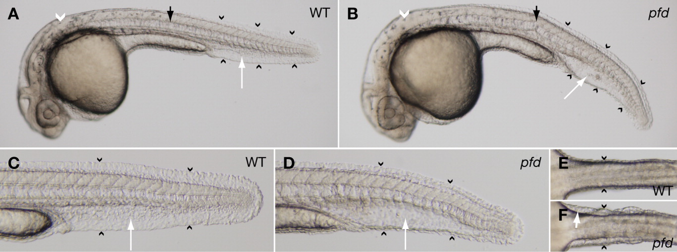 Fig. 1 The pfdgw1 mutation disrupts notochord and vascular development. A: The notochord (black arrow), caudal vein (white arrow), and fin fold (black arrowheads) form normally in wild-type embryos, and melanin pigmentation is present (white arrowhead). B: pfdgw1 mutants exhibit notochord kinking (black arrow), a cavernous caudal vein with loss of the usual reticular venous plexus (white arrow), and fin fold attenuation (black arrowheads). Melanin pigmentation is present (white arrowhead). C: Fin fold (arrowheads) and caudal vein (arrow) in a wild-type embryo. D: Attenuated fin fold (arrowheads) and cavernous caudal vein (arrow) typical of pfdgw1 mutants. E,F: Ventral views of a wild-type embryo (E) and a pfdgw1 mutant (F) demonstrating skin distention secondary to edema in the mutant (F, arrowheads). Red blood cells have extravasated into the edematous area (F, arrow). All embryos were photographed at 30 hours postfertilization (hpf).