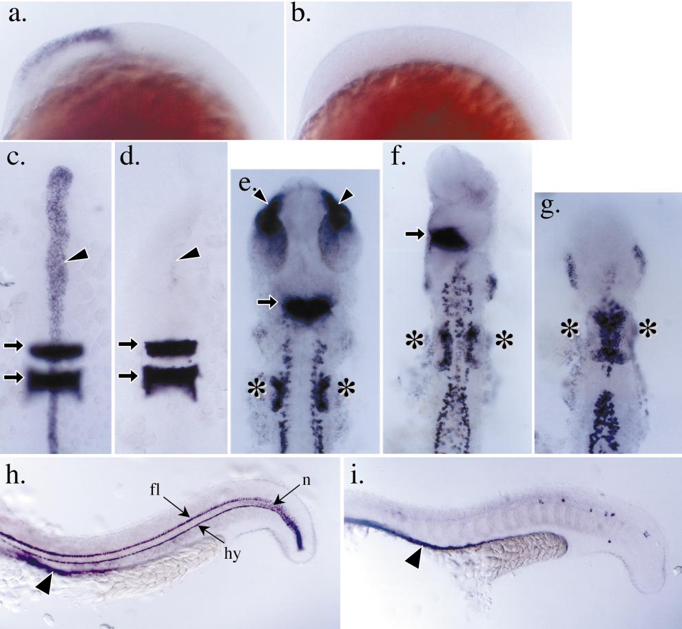Fig. 6 Impaired anterior neural ectoderm patterning in boz mutants. (a and b) Profile views of the developing head region in postgastrula embryos (14 hpf); the expression of emx1 is detected in the developing forebrain region in wild-type embryos (a) and absent in severely affected boz mutant embryos (b). (c and d) The expression of the floorplate and notochord marker, shh, and hindbrain marker, krox20, in the anterior of wild-type and boz mutant embryos, respectively, at 12 hpf. The embryos have been removed from their yolk cell and mounted flat between coverslips. Anterior is toward the top. At this stage in wild-type embryos (c), shh expression (arrowhead) is detected in the dorsal midline and krox20 is expressed in the hindbrain region in presumptive rhombomeres 3 and 5 (arrows). In severely affected boz mutant embryos (d), the expression of shh is reduced or absent, but the development of the hindbrain indicated by the expression of krox20 appears unaffected. (e– g) Expression of paxb in wild-type and boz mutant embryos at 22 hpf. Embryos have been removed from their yolk cell and mounted flat with anterior toward the top. Embryos are aligned with the anterior extent of the pronepherous at the bottom. (e) In the anterior of wild-type embryos, paxb expression is detected in the developing eye stalks (arrowheads), the midbrain–hindbrain boundary (arrow), the otic placodes (asterisks), the neurons, and the pronepherous. (f, g) boz mutant embryos can be grouped into a series of truncations of anterior neuronal fates. For example, mildly affected boz mutants (f) exhibit a loss of eye stalk expression and a reduced midbrain–hindbrain boundary expression of paxb. In severely affected boz embryos (g), these anterior neural deficiencies are enhanced to include a loss of midbrain–hindbrain expression of paxb. Note that the otic placodes in these severely affected mutants appear to be enlarged (asterisks). (h and i) Expression of α-coll2a in the trunk and tail of wild-type and boz mutant embryos, respectively, at 22 hpf. At this stage in wild-type embryos (h), α-coll2a is detected in the floorplate (fl), notochord (n), hypochord (hy), and axial endoderm (arrowhead). In boz mutant embryos (i), the floorplate, notochord, and hypochord are reduced or absent. However, the expression of α-coll2a in the axial endoderm is still detected ventral to the dorsal midline (arrowhead).