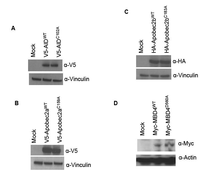 Expression levels of wild type and catalytically-inactive derivatives of AID (A), Apobec2a (B), Apobec2b (C) and Mbd4 (D) were compared by transfection in RKO cells and detection in total cellular extracts by antibodies against the epitope tags as indicated.