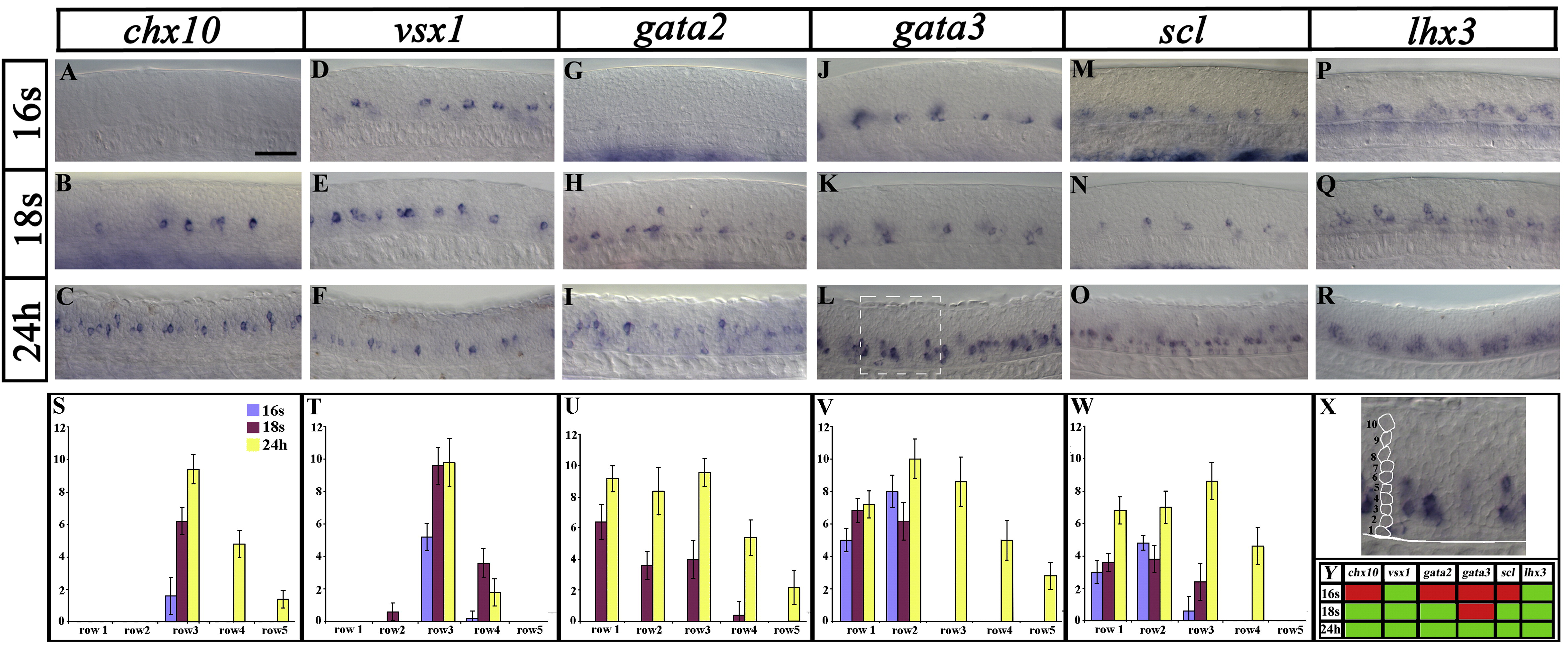 Fig. 1 Expression of V2 transcription factors in wild-type embryos. (A–R and X) Lateral views of the spinal cord and underlying notochord in wild-type embryos at 16 somites (17 h), 18 somites (18 h) and 24 h. Anterior is left, dorsal is up. Scale bar = 50 μm (A–R). (A–F) chx10 and vsx1 are expressed in the V2 domain (rows 3–5 depending on stage). (G–R) lhx3, scl, gata3 and gata2 are expressed both in the V2 domain and more ventral spinal cells. At 16 somites, vsx1 (D) and lhx3 (P) are already expressed in the V2 domain, but gata2 (G), gata3 (J), scl (M) and chx10 (A) are not. By 18 somites gata2 (H) and scl (N) are also expressed in the V2 domain. (S–W) number of cells in rows 1–5 expressing particular genes at 16 s (blue bars), 18 s (red bars) and 24 h (yellow bars). None of these genes were expressed in cells dorsal to row 5. All cell counts are from a 5 somite length of spinal cord adjacent to somites 6–10. Values shown are the mean from 5 different embryos. Error bars indicate standard deviations. Panel X shows a magnified view of the white dotted box in panel L demonstrating how cell rows were counted. For each positive cell, the number of cells between it and the notochord were counted to determine which row it was in. Cell row numbers were counted ventral to dorsal (e.g. cells directly above the notochord are in row 1). Example row numbers are illustrated for the column of cells on the left of the picture. Panel Y shows a schematic representation of when genes are expressed in the V2 domain (red: gene not expressed at that time point in the V2 domain, green: gene expressed at that time point in the V2 domain).