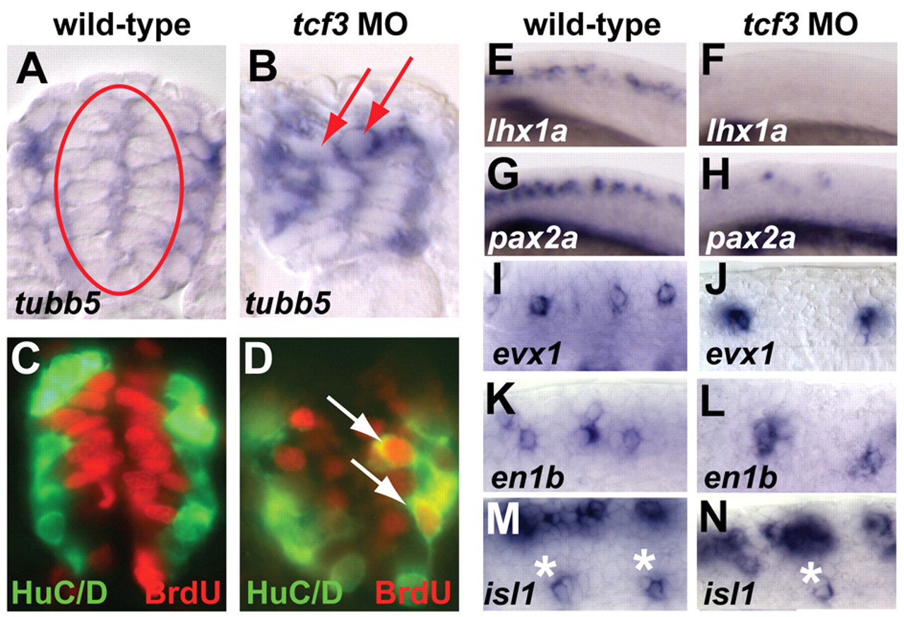 Fig. 5 Spinal progenitors lacking Tcf3 precociously express neuronal markers. (A,B) Cross-sections of tubb5 in situ hybridization at 18 hpf show that tcf3 morphants have ectopic tubb5-positive cells in the medial progenitor domain (arrows). (C,D) Double labeling for HuC/D (green) and BrdU (red) at 24 hpf shows BrdU-positive Hu-positive cells (arrows) in tcf3 morphants, some of which are in the medial domain. (E-N) Lateral whole-mount views of postmitotic neuronal markers at 18 hpf. (E-H) lhx1a and pax2a, which mark multiple classes of spinal interneurons, are drastically reduced in tcf3 morphants. (I-N) evx1+ interneurons, en1b+ interneurons and isl1+ primary motoneurons (asterisks) are also reduced in tcf3 morphants.