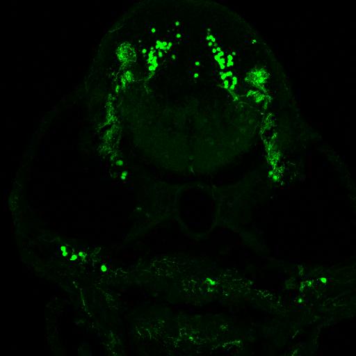 Expression: Trigeminal and Vagal cranial ganglia with cuadal projections down the tail and projections anteriorly,few scattered cell bodies in MB, spinal cord neurons, many distinct cell bodies throughout the hindbrain, few cell bodies in olfactory region, eye - cell bodies in ONL (bipolar), RGCs? and few PRCs, plexiform layers not expressing, eye expression varies slightly