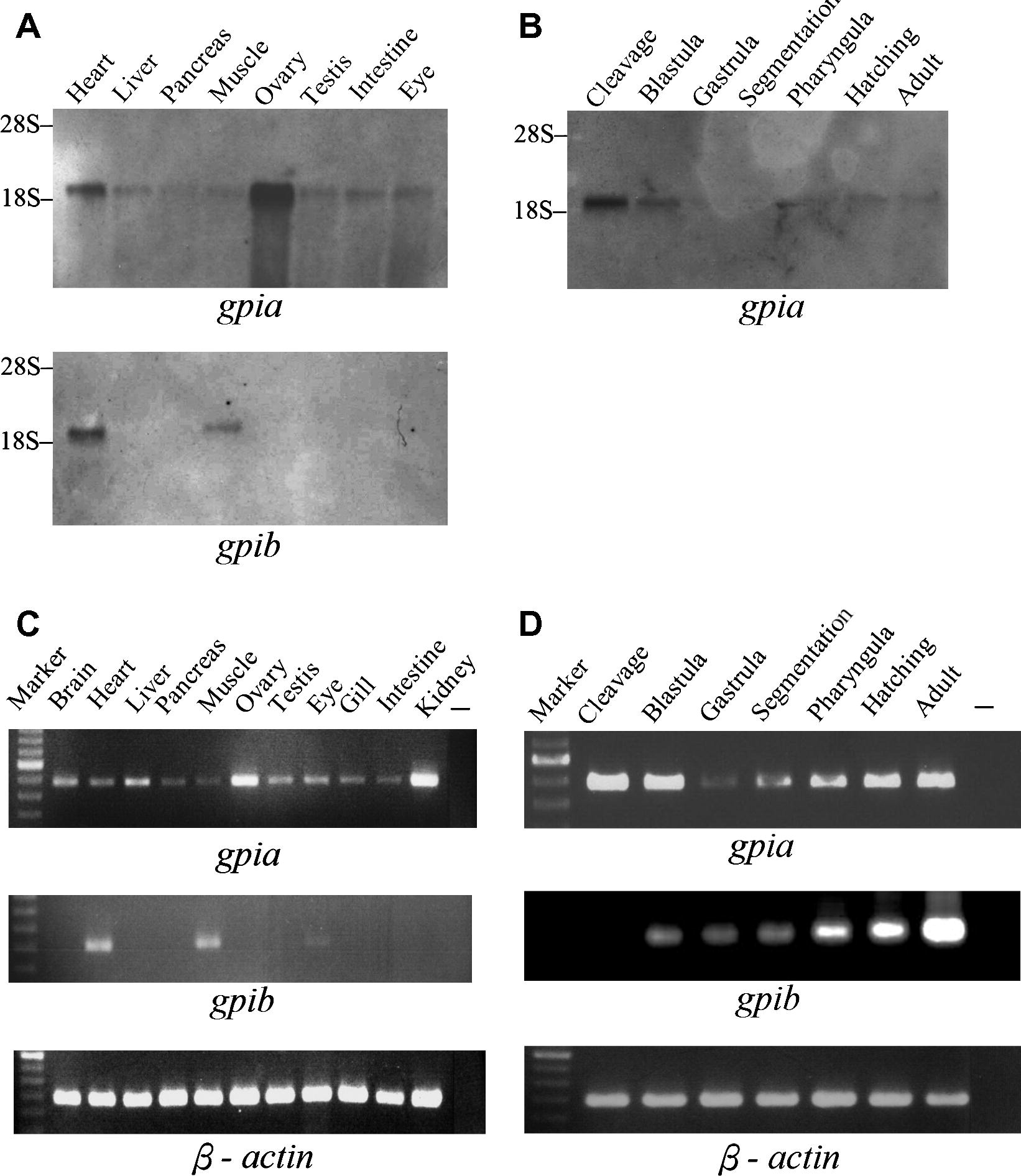 Fig. 3 Tissue and developmental expression of zebrafish gpia and gpib. (A) Northern analysis of gpia and gpib mRNA in adult tissues. The positions of 28S and 18S rRNA are indicated. (B) Northern analysis of gpia mRNA at various stages of zebrafish development. (C, D) RT-PCR analysis showing the expression of gpia and gpib in adult tissues (C) and at various developmental stages (D). Marker, 100 bp marker with the brightest band at 800 bp; -, negative control using water as template. PCR amplified 683 bp, 402 bp, and 492 bp fragments from gpia, gpib and β-actin cDNA, respectively. β-Actin was used as a reference gene for control of the amount of RNA input and sensitivity of RT-PCR analysis.