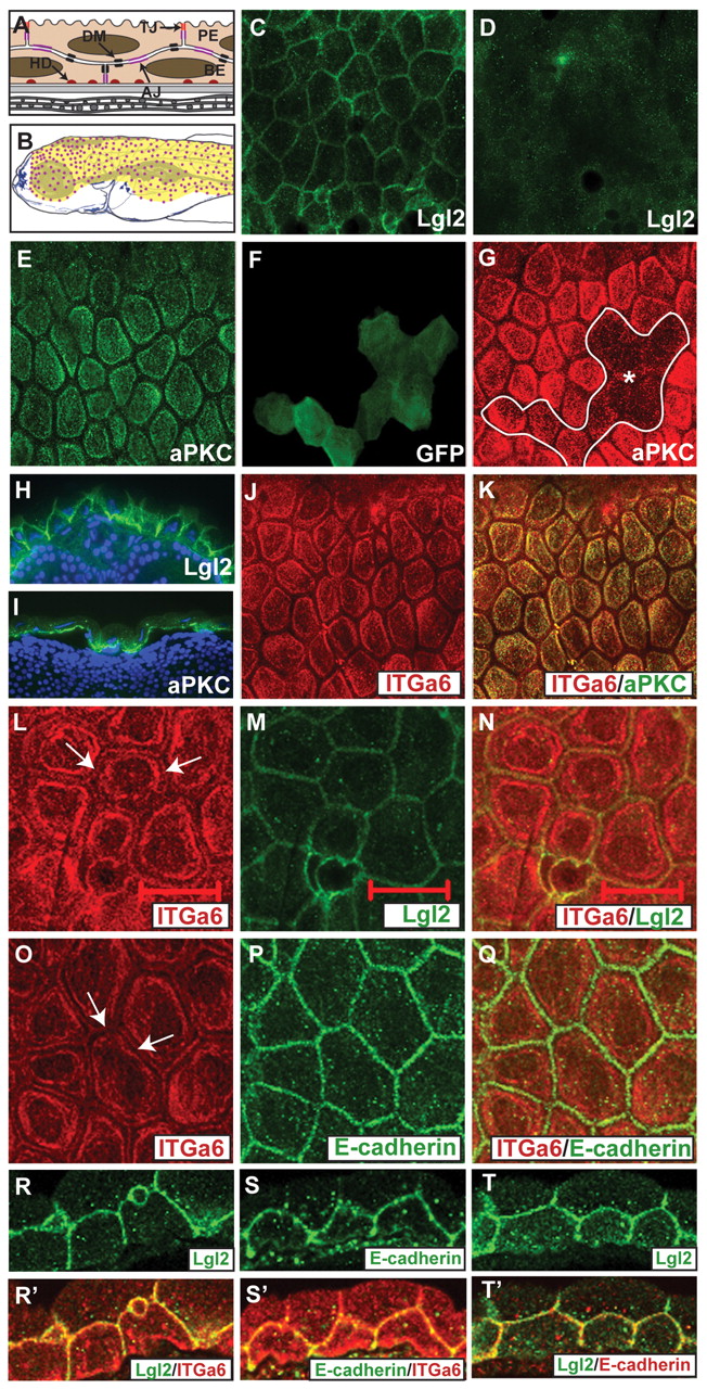 Fig. 1 The localisation of Lgl2, aPKC, Itga6 and E-cadherin in 4- to 5-day-old zebrafish basal epidermis. (A,B) Schematic representation of the zebrafish bi-layered epidermis (A) and the epidermal region of 5-day-old larvae (B), which exhibits hemidesmosomes (red dots). (C-T′) Immunostaining using anti-Lgl2 (C,D,H,M,R,T), anti-aPKC (E,G,I,K), anti-GFP (F), anti-Itga6 (J,K,L,O,R′,S′) and anti-E-cadherin (P,S) antibodies. In the basal epidermis, Lgl2 localises to the lateral domain (C,H). Control lgl2 mutant epidermis does not show any specific Lgl2 staining (D). By contrast, aPKC is localised to the basal domain (E,I). Epidermal clones injected with a morpholino against aPKCλ (F) exhibit a reduction in aPKC expression (G). At the basal domain, Itga6 (J,K) and aPKC (K) co-localise. Co-staining of Itga6 and Lgl2 in whole-mounts (L-N) and sections (R,R′), and of Itga6 and E-cadherin in whole-mounts (O-Q) and sections (S,S′), reveals that a minor Itga6 fraction is localised at the lateral domain (arrows in L,O). Co-staining of Lgl2 and E-cadherin in sections reveals an overlap in their localisation (T,T′). Asterisk, basal epidermal clone. PE, periderm; BE, basal epidermis; AJ, adherens junctions; DM, desmosomes; HD, hemidesmosomes; TJ, tight junctions. Scale bar: 40 μm in C-G,J,K; 22.5μm in H,I; 20μm in L-T′.