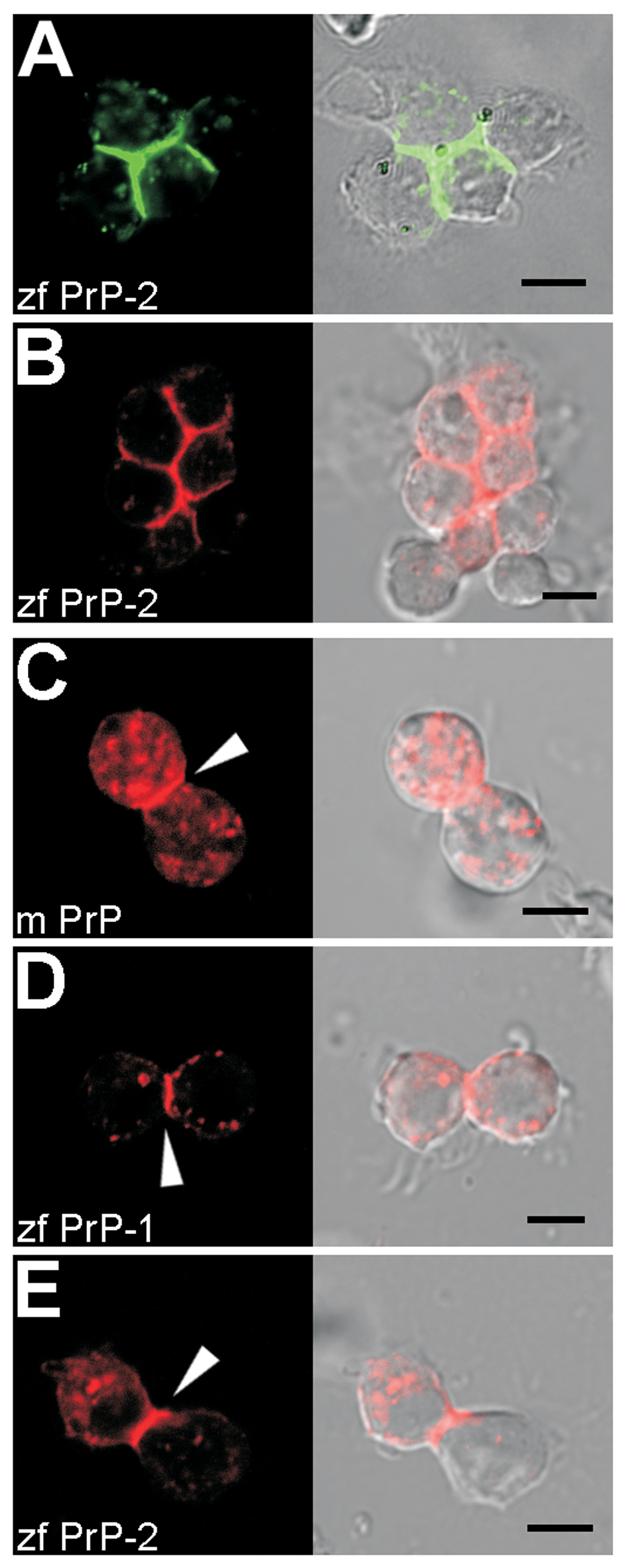 Heterologous expression of PrPs induces cell aggregation, as shown for zebrafish PrP-2 (zf PrP-2) EGFP (A) and DsRed-monomer (B) fusion proteins. Accumulation at cell contacts of mouse PrP (m PrP, [B]), zf PrP-1 (C), and zf PrP-2 (D) DsRed-monomer fusion proteins are equally evident (arrowheads). Scale bars indicate 5 μm.