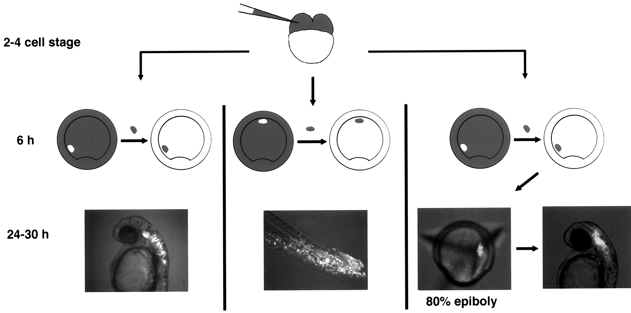 Fig. 2 Fate mapping by homotopic transplantation. Fate mapping by single-cell injection indicated that hindbrain progenitors are located at a sector 40–90° from the midline of a shield-stage gastrula. (First panel) Labeled grafts taken from this region and placed into the same position in an unlabeled host gave rise to cells that spanned the entire hindbrain region, as predicted by the fate map. (Second panel) A labeled graft made to the ventral most sector of the ectoderm gave rise to cells in the posterior trunk and tail, which include ectodermal cells, endoderm, and somitic cells. (Third panel) To map the position of hindbrain progenitors at 80% epiboly, labeled cells were orthotopically replaced into the shield-stage embryos, and the location of labeled cells was tracked at 80% epiboly. The majority of the hindbrain progenitors fate map to the middle third of the epiblast, adjacent to the dorsal axis.