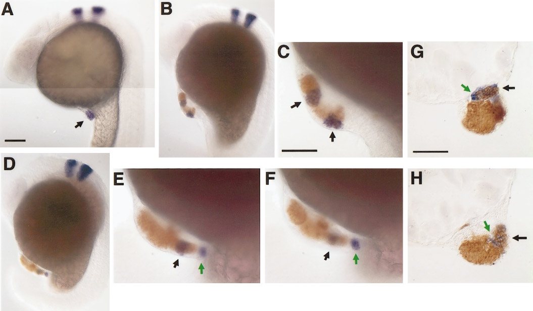 Fig. 6 Committed hindbrain cells express coherent patches or stripes of Krox20. (A) A single patch of Krox20 (arrow) is present in the 80HV graft. (B, C) Two distinct stripes of Krox20-positive cells (blue color) are expressed by the 80HV graft. Note that both Krox20 domains (C, arrows) are within the biotin-visualized lineage tracer territory (orange). (D–F) Another example with two distinct domains of Krox20: one stripe of Krox20 is expressed by grafted cells (black arrow); the other patch is expressed by host cells (devoid of lineage label that marks donor cells (green arrow). This host-derived Krox20 domain is continuous with the graft-derived structure extending outward from the yolk. (G, H) Histological sections of different embryos illustrating that graft-derived (black arrows) and host-derived (green arrows) Krox20-expressing cells are intermingled in the same structure. All scale bars: 100 μm.