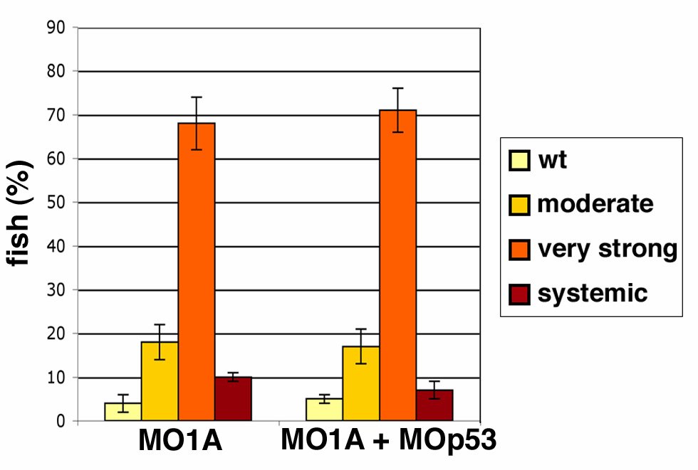 Forebrain apoptosis assay: Quantitative evaluation of apoptosis in appl1 morphants (8 ng MO1A) in which unspecific cell death is blocked by concurrent knock-down of p53 (MO1A + MOp53: 8 ng MO1A + 4 ng MOp53). Embryos were assigned to one of four cell death categories: wt, moderate, very strong forebrain and systemic apoptosis. 5 independent experiments were carried out. Evaluation of Appl1 knockdown (MO1A: 8 ng MO1A) embryos (presented in Figure 4G) is shown again for comparison. Total amount of embryos scored: n MO1A= 532, n MO1A+Mop53= 486. Error bars indicate standard deviation between experiments. All experiments have been carried out on 54 h zebrafish embryos. Efficient knock-down of p53 by 2 ng of the utilized MOp53 has been previously demonstrated (Nowak et al., 2005).