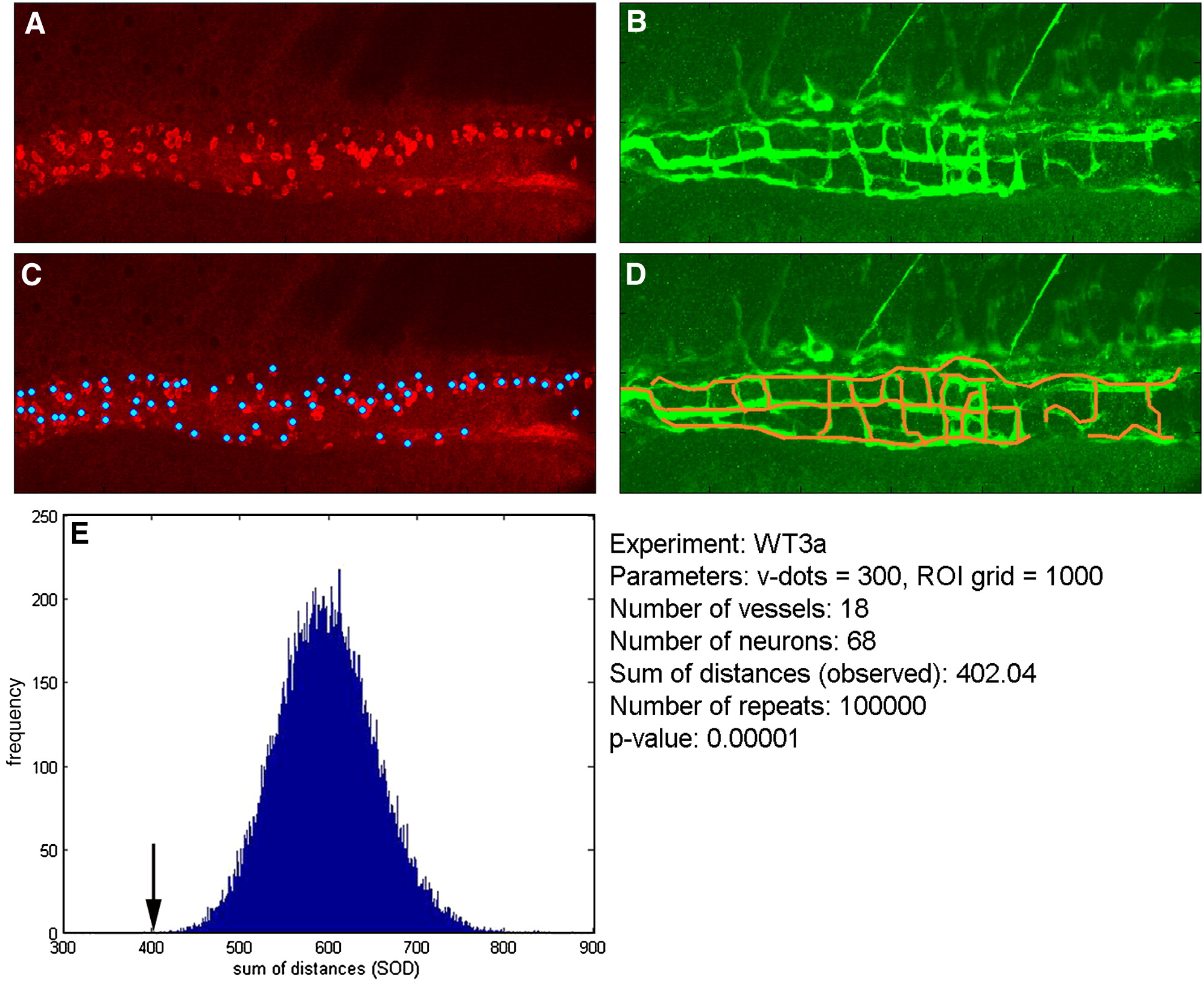 Fig. S3 The juxtaposition of ENCCs and vessels in the zebrafish intestine is non-random. Gut region of a Tg(fli:EGFP) embryo at 5 dpf, showing enteric neurons (A,C; HuC, red) and subintestinal vessels (B,D; EGFP, green). Neurons (C) and vessels (D) of each imaged gut (n = 10) were traced using a software tool developed in Matlab© for the purpose of quantifying the proximity of enteric neurons to endothelial cells. Briefly, the distance of each neuron from its proximal blood vessel is computed. The tendency of the neurons to concentrate in the vicinity of the blood vessels is measured by the sum of these distances (Sum of Shortest Distances, or SSD). We tested the significance of the non-uniform spatial distribution of the neurons by estimating the probability distribution function of the SSD for uniformly distributed neurons (shown as bell-shaped curve in E) and comparing it to the experimentally observed SSD, noted by the arrow on the graph in panel (E). The random distribution was computed by keeping the number of neurons fixed (equal to the experimentally measured number), repeatedly assigning random coordinates to the neurons to simulate uniform spatial distribution, and then computing the SSD for each distribution, performing a total of 100,000 repetitions. The software reports a summary of the process (right of panel E), with information on the number of neurons and blood vessels, number of random repetitions, observed SSD, and p-value for the comparison between the random distribution and our experimental results.