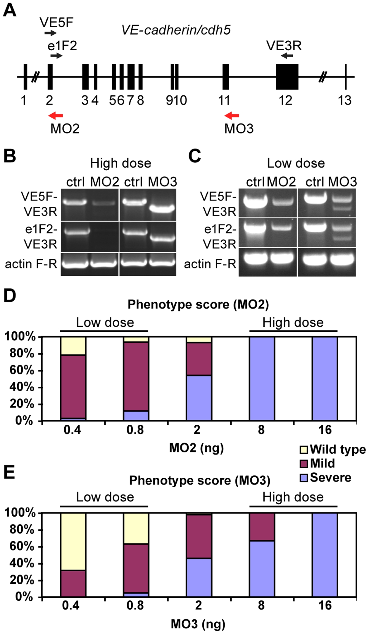 (A) Schematic representation of zebrafish VE-cadherin/cdh5 gene with exons represented as black boxes. The positions of the morpholinos employed in this study are indicated with red arrows, and the primers used for the analysis of splice variants as black arrows (VE5F, e1F2 and VE3R). (B–C) Expression of VE-cadherin was analyzed by RT-PCR using two sets of primers. (B) Upon injection of high doses (16 ng) of VE-cadherin morpholinos, aberrant splicing of VE-cadherin was observed for both MO2 and MO3 when using primer pair VE5F-VE3R. Primer pair e1F2-VE3R allowed the detection of endogenous wild type VE-cadherin transcript in controls (Ctrl) and proved the absence of this transcript in MO2 injected embryos (left panel in B). This primer pair confirmed the altered splicing for MO3 injected embryos (right panel in B). Actin was used as an internal control. (C) Injection of low doses of morpholino (0.8 ng) caused partial knockdown of VE-cadherin. These embryos expressed both wild type VE-cadherin and aberrant spliced transcripts. (D–E) Histograms show the quantification of the effect of VE-cadherin morpholinos at 54 hpf. Both MO2 (D) and MO3 (E) cause increased severity of the phenotype increasing the doses injected. With low doses (0.8 ng) most of the embryos present circulation and hemorrhages (mild phenotype). Conversely, injection of high doses of either one morpholino (16 ng) cause a highly penetrant phenotype, with complete absence of blood circulation (severe phenotype). Intermediate amounts of morpholino lead to both mild and severe phenotype in different percentages. MO2 presented higher penetrance than MO3.