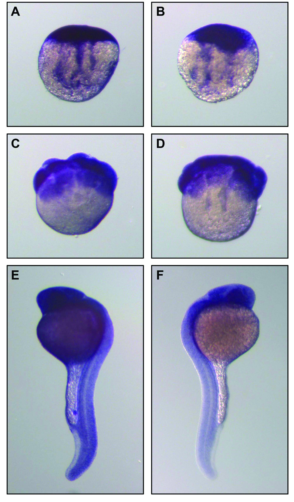 Fig. 4 Localization of RNase Dre1 and RNase Dre2 expression in zebrafish embryos. Whole-mount in situ hybridization analysis was performed in embryos at the 1-cell stage (A, B), 16-cell stage (C, D) and prim 6 stage (E, F). Left panels, RNase Dre2 probe; right panels, RNase Dre1 probe.