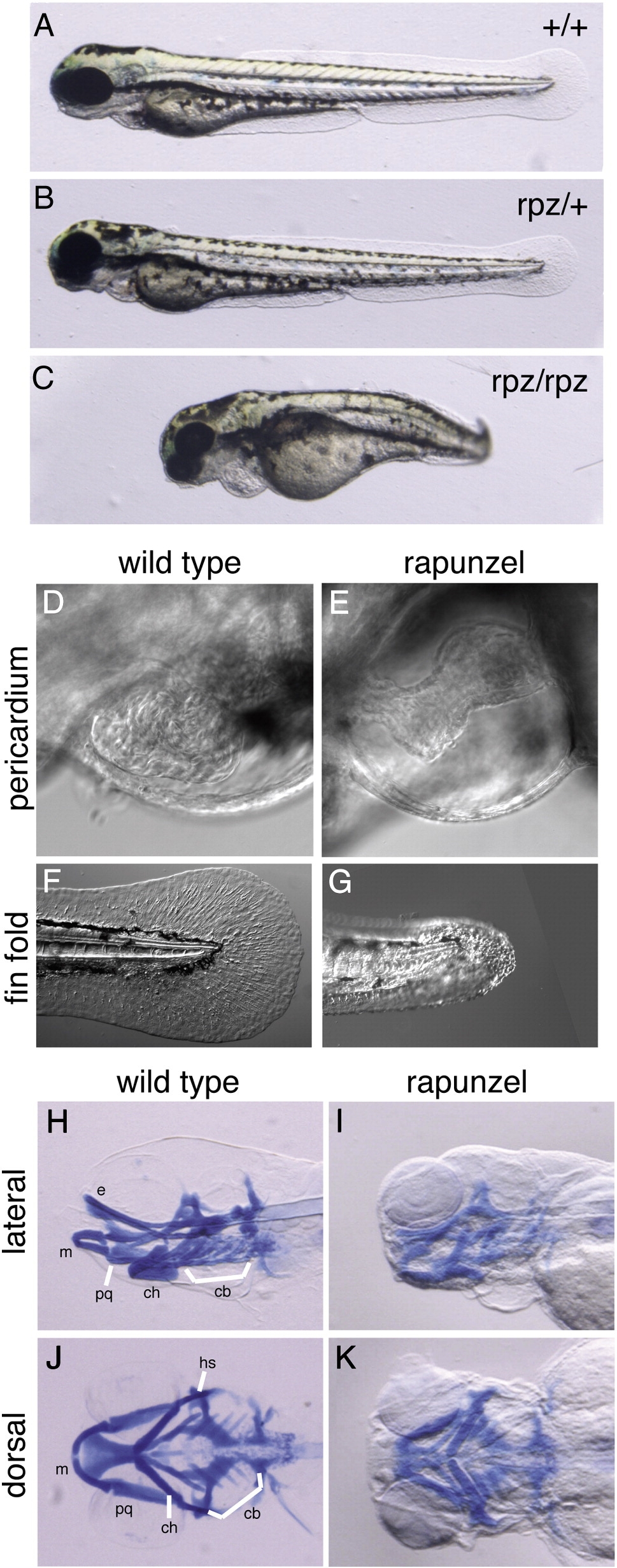 Fig. 1 Phenotype of rapunzel embryos. A–C. Wild type, heterozygous rapunzel and homozygous rapunzel embryos. D–G. Nomarski images of wild type (D, F) and homozygous rapunzel (E, G) embryos at 72 hpf demonstrating pericardial edema (E) and fin fold defects (G) in rapunzel mutants. H–K. Lateral (H, I) and ventral (J, K) views of whole-mount Alcian blue-stained wild type (H, J) and rapunzel (I, K) homozygous mutants at 96 hpf demonstrating reduced development of the craniofacial cartilages in rapunzel mutants. Craniofacial structures labeled as in Piotrowski et al., 1996; bh: baihyal, cb: ceratobranchial, ch: ceratohyal, e: ethmoid plate, hs: hyosymplectic, m: Meckel′s cartilage, and pq: palatoquadrate.