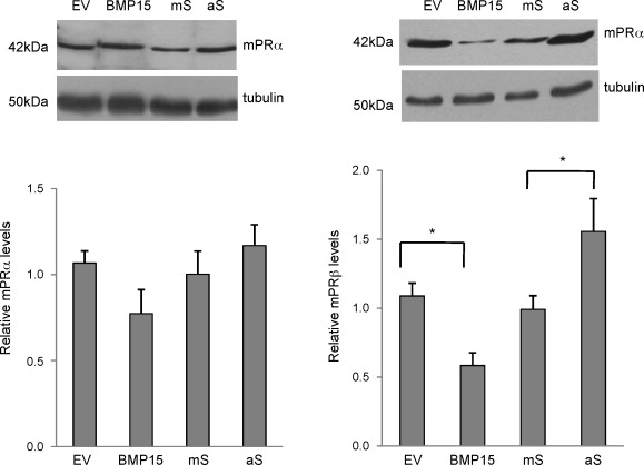 Fig. 2 BMP-15 inhibits mPRβ, but not mPRα expression. To overexpress BMP-15, oocytes were microinjected with plasmid DNA carrying the coding sequence of zebrafish BMP-15 (1 ng/follicle) or equal amount of the empty vector as the negative control. To knockdown BMP-15, oocytes were injected with an antisense oligonucleotide (0.5 ng/follicle) targeting the translation initiation site of BMP-15. A missense oligonucleotide was used as the negative control. Proteins were extracted at 18 h after microinjection and expression of the mPRα and mPRβ was detected by Western blot analysis using mPRα and mPRβ antibodies. Equal loading was confirmed by Western blotting probed with an α-tubulin antibody. Data represent mean ± S.E.M. of five experiments.*p < 0.05. EV, empty vector control. aS, antisense oligonucleotides; mS, missense oligonucleotides.