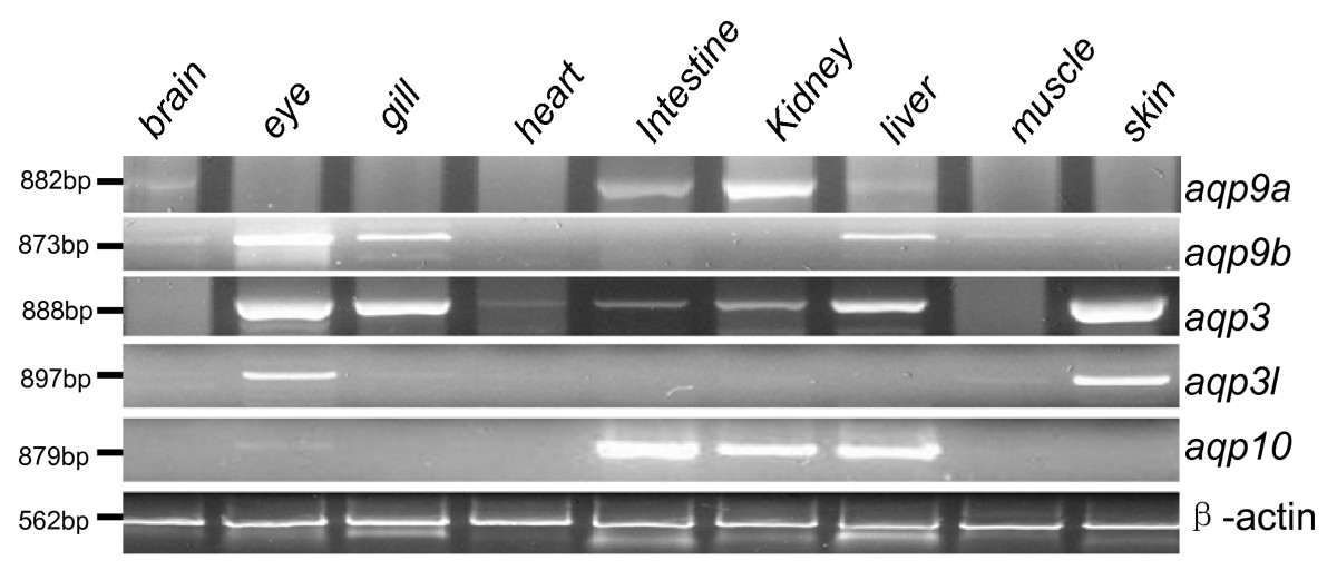 Fig. 3 Expression of mRNA of zebrafish aquaglyceroporins.The expression of mRNA of aqp9a, aqp9b, aqp3, aqp3l, and aqp10 in isolated zebrafish tissues. Tissues were isolated from adult zebrafish, homogenized, and total cDNA was obtained. A zebrafish β-actin gene was used to be a positive control.