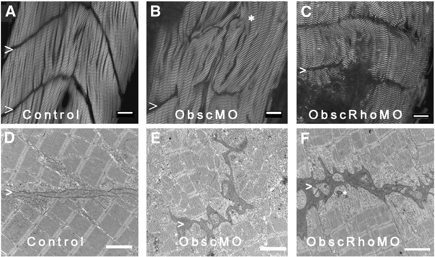 Fig. 3 Architecture of the myotendinous junction (MTJ). Confocal analysis using α-actinin (a Z disk component) immunolabeling (A–C) to assess myofibril morphology and ultrastructural analysis (D–F) to define the architecture of the MTJ was performed in control (A, D), obscurin A morphant (B, E) and obscurin A RhoGEF morphant (C, F) embryos at 72 hpf. In control embryos, the skeletal myocytes are aligned in parallel and the myotendinous junctions are well defined (A, D: >). The skeletal myocytes in obscurin A (ObscMO) morphant embryos vary in length and in their relationship to each other (∗) with elongated myocytes extending past very rudimentary somite boundaries (B, E: >). When compared to the ObscMO embryos, the obscurin A RhoGEF (ObscRhoMO) morphant embryos demonstrate a more consistent relationship between adjacent myocyte (more uniform parallel arrangement) and normal positioning of a complete or nearly complete somite boundary (C,F: >). However, the boundary is not sharply defined as in control embryos and often appears electron dense and irregular, not unlike the rudimentary boundaries/MTJs noted in ObscMO embryos. Scale bars are 20 μm (A–C) and 2 μm (D–F).