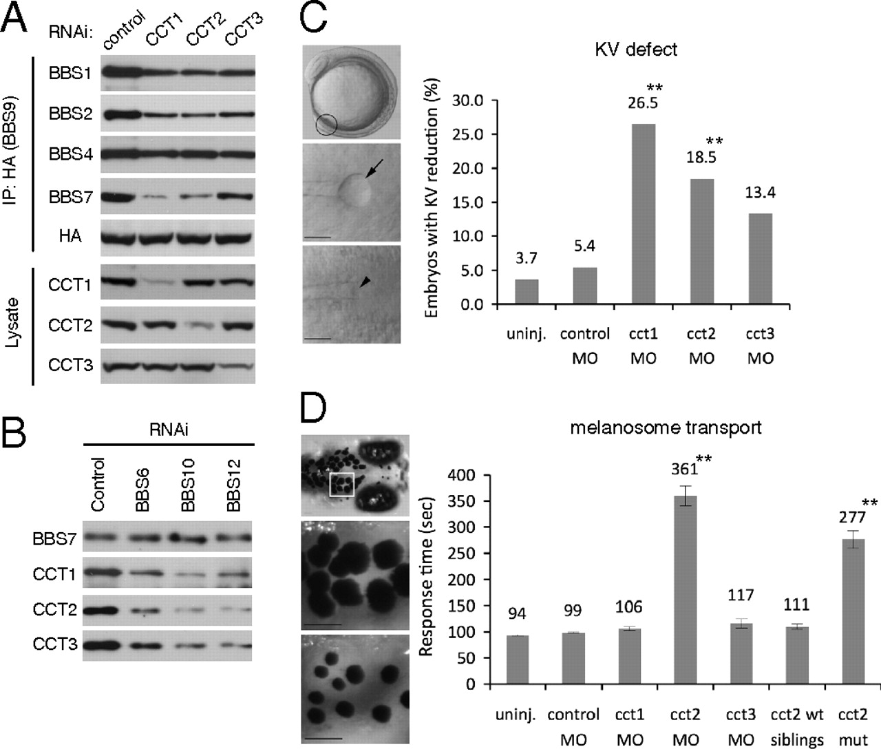 Fig. 4 Requirement of CCT activity for BBSome assembly, (A) CCT chaperonins are required for BBSome assembly. HA-BBS9 was cotransfected with siRNAs against CCT1, CCT2, CCT3, or control in HEK293T cells, and BBS9-associated BBSome subunits were probed by immunoprecipitation followed by immunoblotting. (B) Chaperonin-like BBS proteins are required for the interaction between BBS7 and CCT chaperonins. Expression of BBS6, BBS10, and BBS12 was blocked by RNAi in HEK293T cells, and endogenous BBS7 was immunoprecipitated in control, BBS6-, BBS10-, and BBS12-depleted cells. Association of CCT chaperonins with BBS7 was measured by immunoblotting. (C) MO-mediated knockdown of CCT chaperonins results in Kupffer’s vesicle (KV) defects in zebrafish. Representative images of zebrafish embryos and KVs are shown at Left. (Top) Lateral view of a 10-somite stage embryo with the location of the KV circled, dorsal views; (Middle and Bottom) of a normal KV (arrow) and a reduced KV (arrowhead) at the 10-somite stage. Embryos were injected with 15 ng of indicated MOs, except for cct1, for which a 5-ng dose was used because of severe developmental defects and lethality. The percentage of embryos with reduced or absent KVs are represented for each MO treatment. Sample size and P values are in Table S2. **P < 0.01 determined by Fisher’s exact test compared with control MO-injected group. (D) Retrograde melanosome transport is delayed in cct2 morphants and genetic mutants. Melanosome transport is assessed by monitoring melanosome trafficking in the head region of zebrafish (Top). Below are representative images of the boxed area with dispersed melanosomes of dark-adapted zebrafish before epinephrine treatment (Middle) and contracted melanosomes after epinephrine induced transport (Bottom). Rate of melanosome transport to the endpoint (perinuclear distribution) is noted in seconds on y-axis. Data are represented as mean ± SEM. **P < 0.01, determined by one-way ANOVA and Tukey test. (Scale bar, 100 μm.)