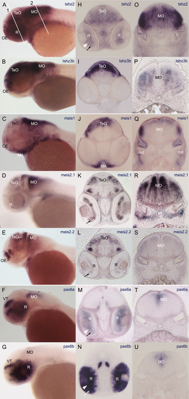 Fig. 5 Spatial expression pattern of tshz2, tshz3b, meis1, meis2.1, meis2.2, pax6a, and pax6b in 48 hours postfertilization (hpf) embryos revealed by RNA in situ hybridization. A-G: Lateral views with dorsal up and anterior to the left. H-U: Transversal vibratome sections at the eyes (left pictures) and rhombomere5 (right pictures) level. A-G,O-U: All genes are expressed in medulla oblongata. H-L: tshz2 is expressed in the midbrain (H) such as tshz3b and meis genes, although coexpression takes place at different dorsoventral levels (H-L). A,B,C,E: tshz2 coexpresses with tshz3b, meis1, and meis2.2 in the olfactory epithelium. In H,K,L,M,N, it is possible to observe that tshz2, meis2.1, meis2.2, pax6a, and pax6b, respectively, are expressed in the neural retina. Lines (1) and (2) in (A) mark the approximate section planes shown in the middle and right columns. MA, mandibular arch; md, mesoderm; MO, medulla oblongata; OE, olfactory epithelium; R, retina; TeO, tectum opticum; Th, thalamus; PTv, ventral posterior tuberculum; VT, ventral tectum. Arrowhead: ganglion cell layer. Arrow: Inner nuclear layer.