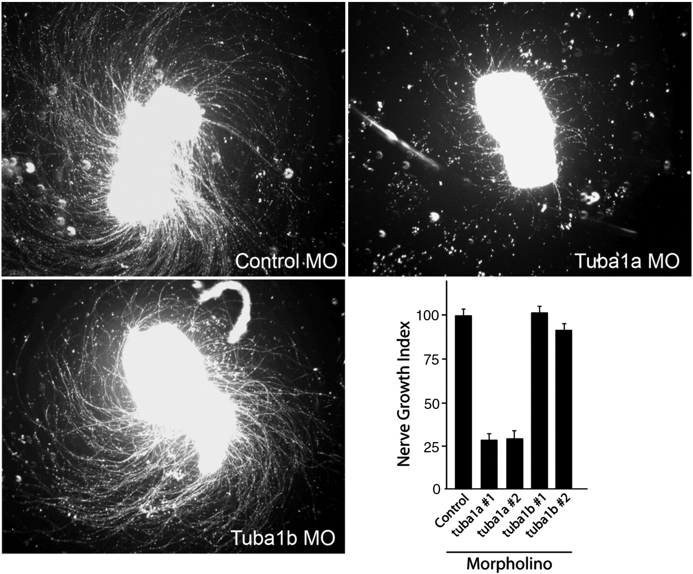 Fig. 2 Knockdown of Tuba1a, but not Tuba1b, inhibits RGC axon regeneration in retinal explants. Control, tuba1a or tuba1b-targeting morpholino-modified antisense oligonucleotides (MO) were delivered to RGCs in vivo by placing MO-soaked Gelfoam on the sectioned optic nerve stump. The next day the Gelfoam was removed and 3 days later retinas were isolated, diced and placed in explant culture for 4 days prior to analysis of neurite outgrowth. Shown are representative images of axon outgrowth. The lower right-hand graph shows Nerve Growth Index (see Experimental methods) for control MO and 2 different MOs, #1 and #2, targeting different tuba1a and tuba1b sequences, respectively. Nerve Growth Index values were normalized to control MO-treated samples that were set at 100%. Error bars are standard error of the mean. Note MOs targeting tuba1a, but not tuba1b, dramatically suppress RGC axon regeneration. Experiments were repeated at least 3 times with each MO.