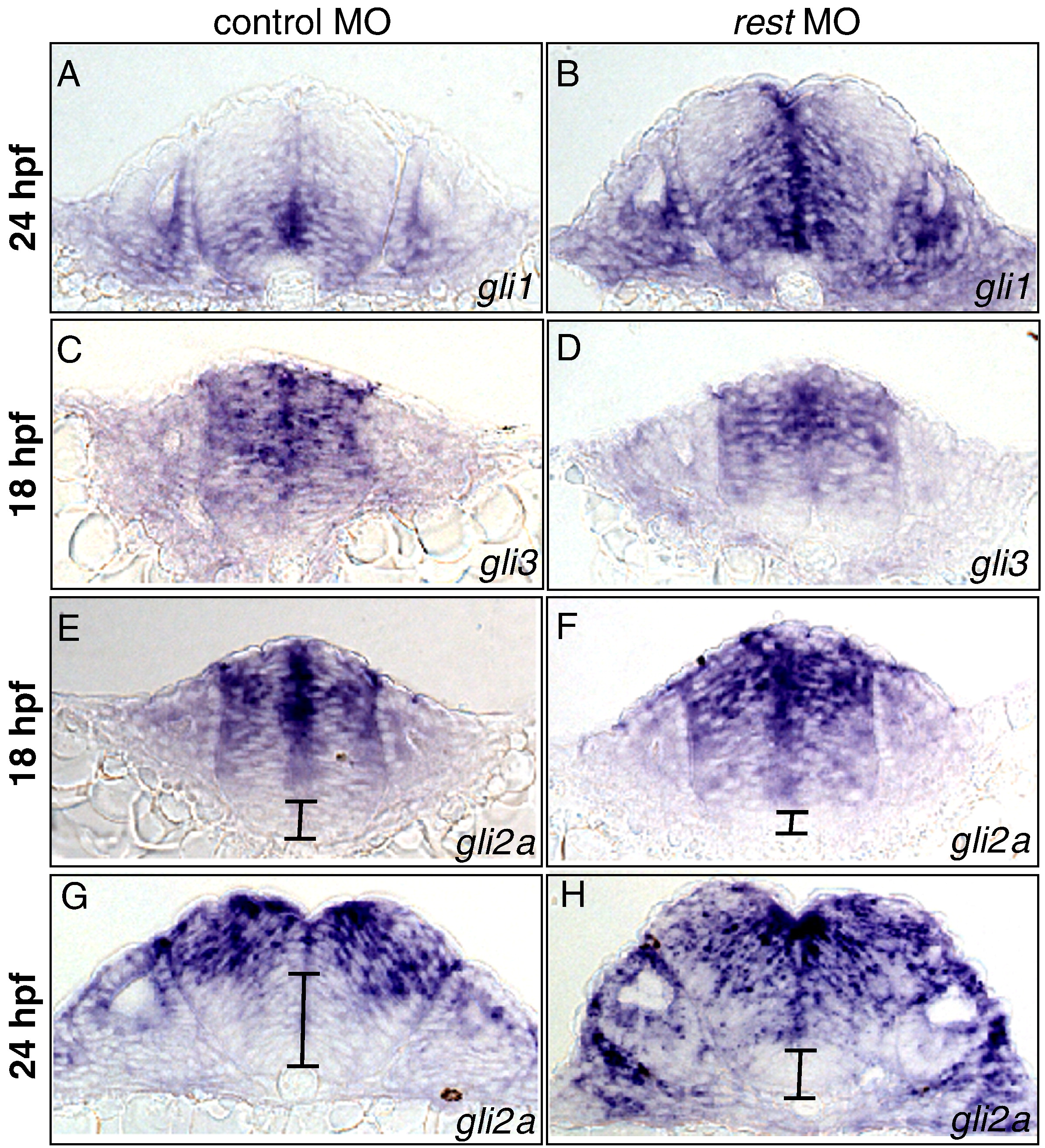 Fig. 6 Rest represses gli2a expression. Transverse sections of the hindbrain of control (A, C, E, G) and stage-matched rest morphants (B, D, F, H). RNA in situ hybridization to monitor gli1 (A, B) gli3 (C, D) and gli2a (E–H) expression. (A, B) gli1 expression is enhanced by Rest knockdown. (C, D) gli3 expression is unaltered by Rest knockdown. (E, G) gli2a expression is downregulated ventrally and in the midline ventricular zone (vz) as development proceeds in control embryos. (F, H) gli2a expression is maintained in the vz and is expressed more ventrally in rest morphants.