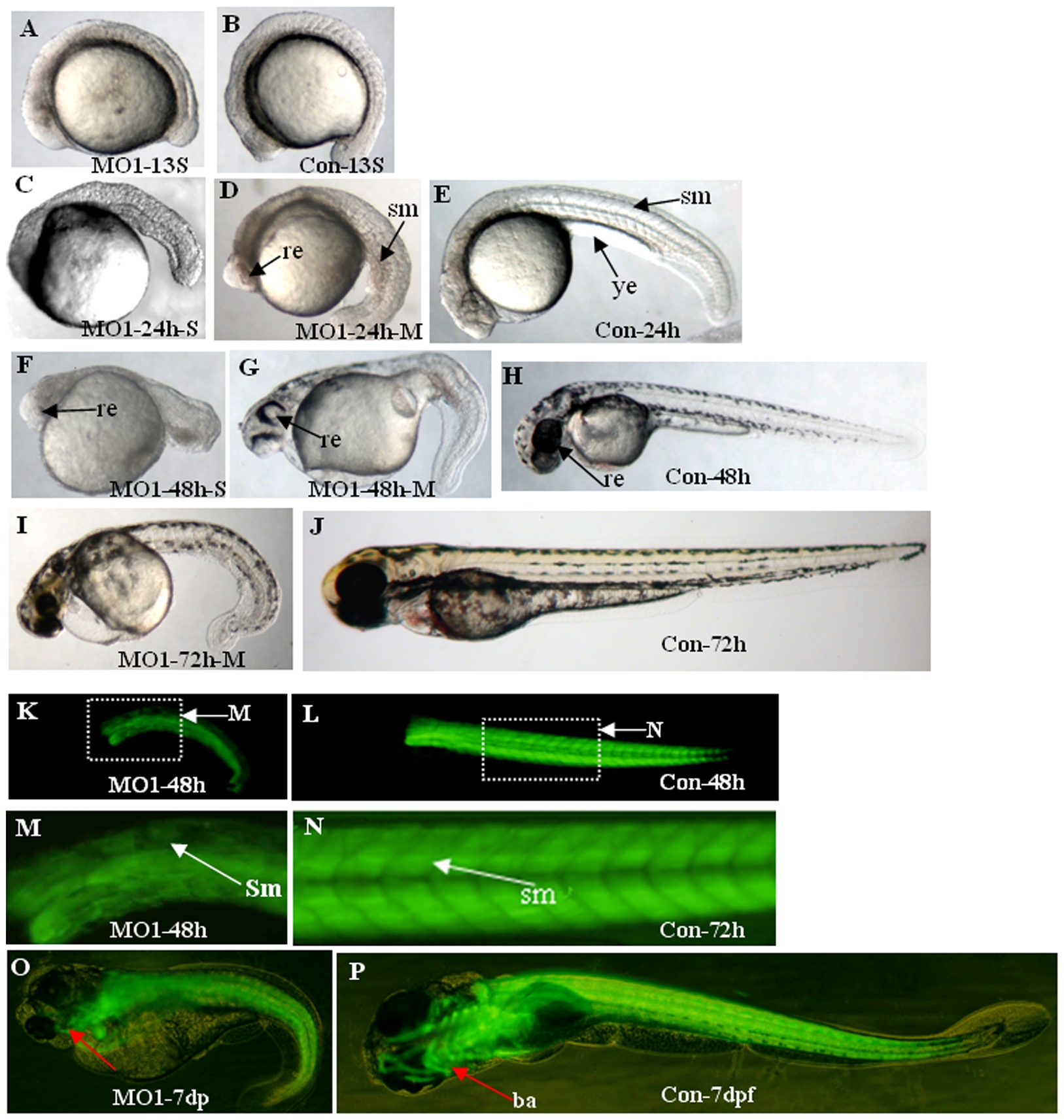 (A–B)13-somite stage. (C–E) 24 hpf. (F–H) 48 hpf. (I–J) 72 hpf. (K–N) somite of mylz2-GFP transgenic zebrafish embryos at 48 hpf. (O–P) mylz2-GFP transgenic zebrafish embryos at 7dpf. A, C–D, F–G, I, K, M and O are Atoh8-MO treated embryos: A, C and F show severe abnormality, D, G, I, K, M and O show mild abnormality, and B, E, H, J, L, N and P are control-MO treated embryos. Atoh8-MO-treated embryos show shrunken eyes and head, a curved body axis with indistinct somite boundaries and yolk extension, accompanied by a U-shaped somite formation. In addition, the branchial arches are greatly reduced(O–P). In all panels but P, the dorsal view is up and the anterior is to the left. P shows the ventral view and the anterior to the left. Abbreviations: re, retina; sm, somite; ba, branchial arches.