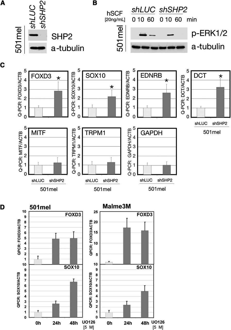 (C) Levels of neural crest and melanocyte transcription factors in shRNA-transduced 501mel cells, determined by Q-PCR. SHP2 deficiency increases transcription of early progenitor (SOX10, FOXD3, DCT, and EDNRB), but not differentiation (MITF, TRPM1) markers. GAPDH is included as a control and all levels are expressed as ratios relative to β-actin (internal control). Asterisk: p < 0.05 by Student′s t test.