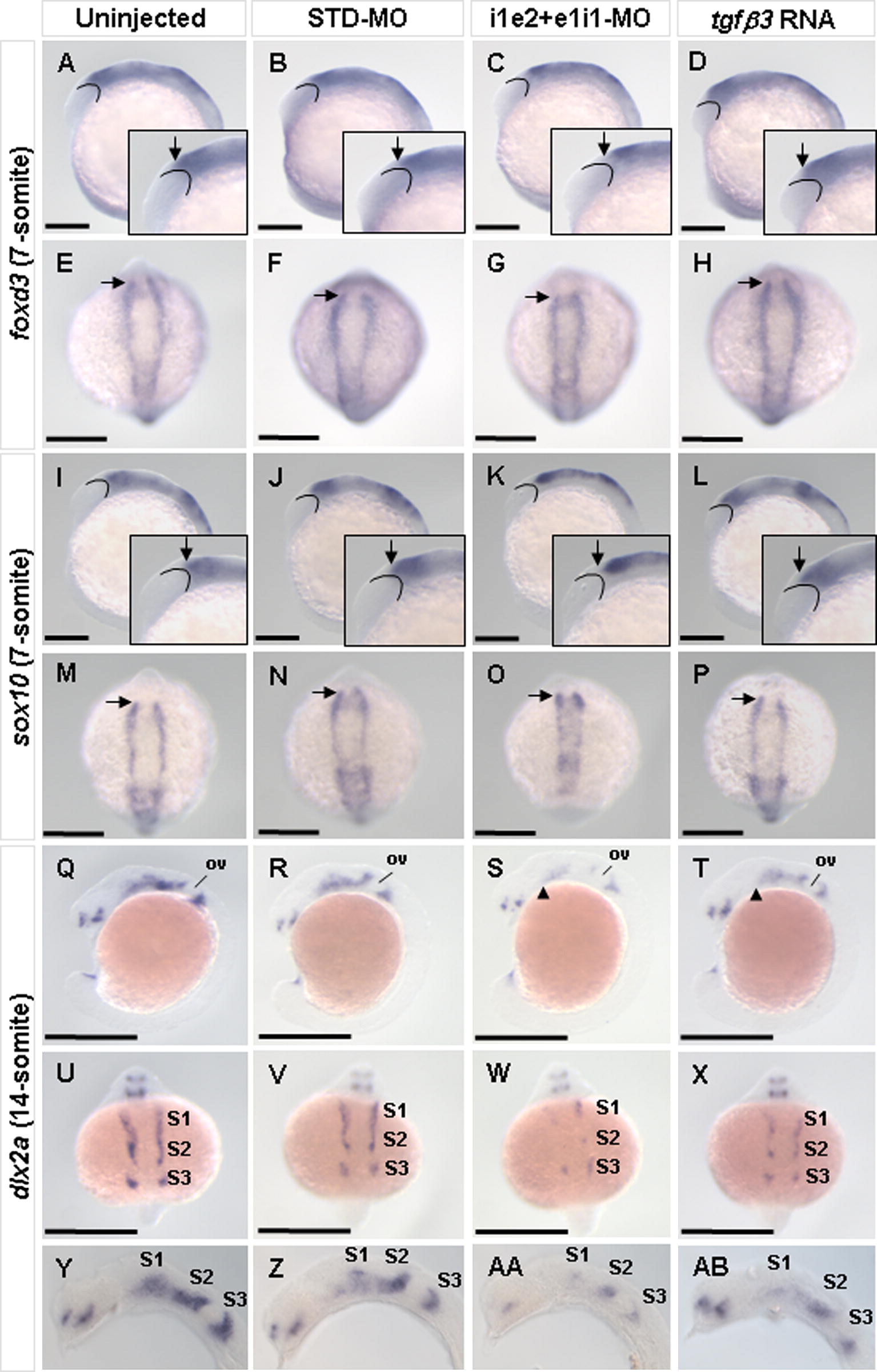 Fig. 6 Effect of tgfβ3 knockdown and over-expression on induction and migration of neural crest cells. Whole-mount lateral (A–D, I–L, Q–T) and dorsal (E–H, M–P, U–X), and flat-mount lateral (Y–AB) views are shown. Expression of the pre-migratory neural crest markers foxd3 and sox10 was similar in the uninjected (inset in A, E, inset in I, M), STD-MO injected (inset in B, F, inset in J, N), and tgfβ3 over-expressing (inset in D, H, inset in L, P) 7-somite stage embryos. In the i1e2 + e1i1 double knockdown morphants, however, a reduction in expression domain at the anterior region of the bilateral rows of pre-migratory neural crest cells (arrow) was observed (inset in C, G, inset in K, O). Expression of the migratory neural crest marker dlx2a was similar in the uninjected (Q, U, Y) and STD-MO injected (R, V, Z) embryos at the 14-somite stage. In the double knockdown morphant (S, W, AA), dlx2 expression is visibly reduced in both intensity and domain, in all three neural crest streams especially around the anterior neural crest region of S1 (arrowhead) and S2. The tgfβ3 over-expressing embryo (T, X, AB) exhibits only a mild reduction in dlx2a expression. Arched lines demarcate posterior boundary of eye primordia. Arrows indicate anterior boundary of pre-migratory neural crest cells. Arrowheads indicate anterior boundary of neural crest stream 1. ov, otic vesicle; S1–S3, neural crest streams 1–3. Black horizontal scale bars, 200 μm.