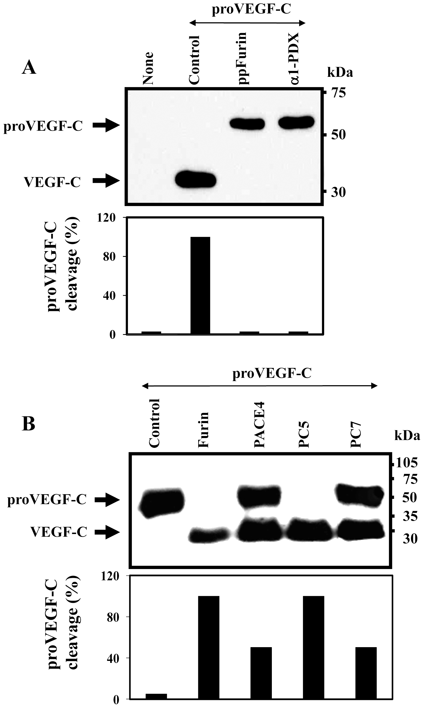 (A) Processing of proVEGF-C was analyzed by Western blotting in zebrafish ZF4 cells transiently cotransfected with pSecTagB (Myc tag) vector containing the zebrafish proVEGF-C cDNA and the empty pIRES2-EGFP vector (Control) or pSecTagB expressing proVEGF-C and pIRES2-EGFP containing the PCs inhibitors; ppFurin or α1-PDX. Results of band intensities are shown in the bar graph that were deduced from the ratio of VEGF-C/(pro-VEGF-C + VEGF-C). Results are representative of three experiments. (B) The processing of proVEGF-C was analyzed by Western blotting using anti-Myc antibody on media derived from PCs-deficient LoVo cells transiently cotransfected with either pIRES2-EGFP vector alone and pSecTagB (Myc tag) containing the zebrafish VEGF-C cDNA (Control) or pIRES2-EGFP vector containing Furin, PACE4, PC5 or PC7 cDNA. The corresponding percentages of band intensities were deduced from the ratio of VEGF-C/(proVEGF-C+VEGF-C). Results are representative of three experiments.