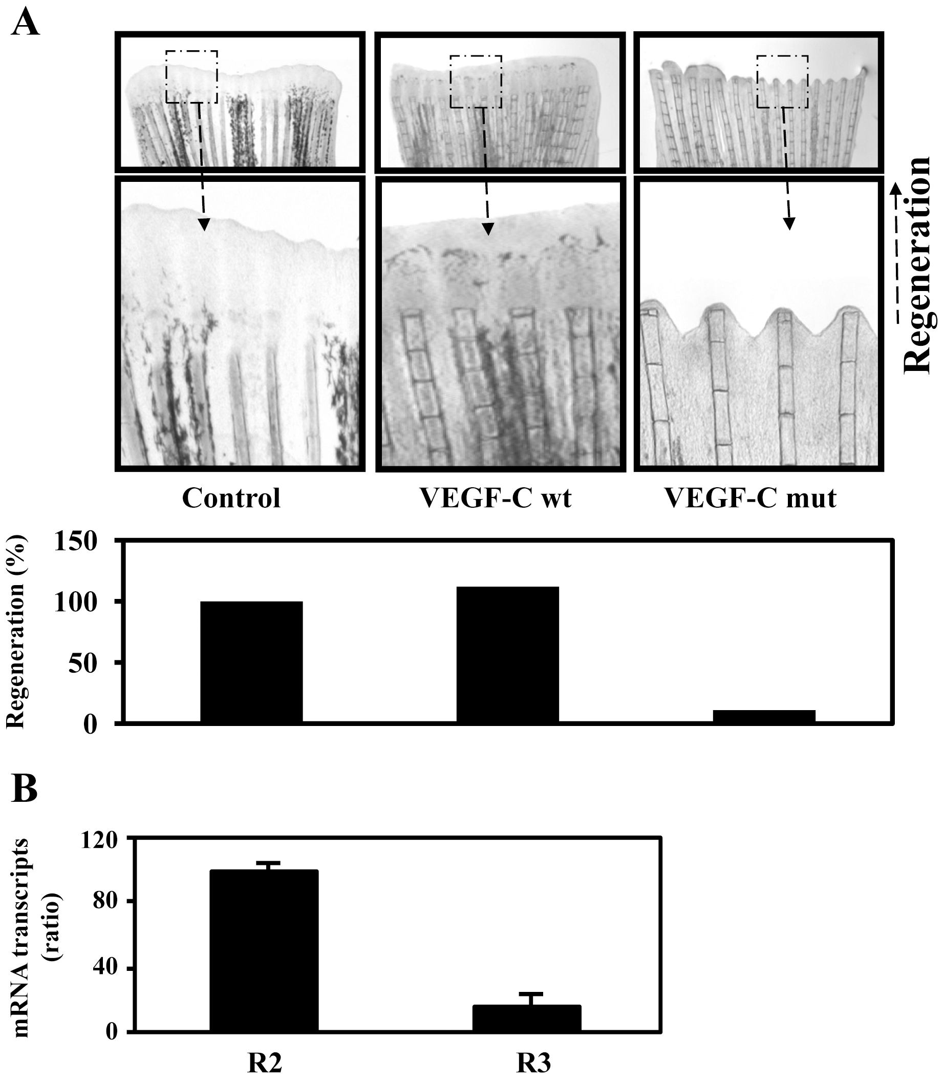 (A) 24 h prior amputation of caudal fins (6 per group), empty vector (Control) or vector containing wild-type (wt) or mutant (mut) proVEGF-C constructs were injected in the fins and animals were allowed to regenerate at 28.5°C after fins amputation for 5 days. The microinjection of vector containing wild-type proVEGF-C had no effect on normal regeneration. In contrast, injection of the mutant proVEGF-C resulted in severe inhibition of fin regeneration. Results are representative of tree experiments. The corresponding percentages of regenerated area were deduced from the ratio of 100 x (fin surface regenerated in VEGF-Cwt)/(fin surface regenerated in Control) and 100 x (fin surface regenerated in VEGF-Cmut/fin surface regenerated in Control). (B) Total RNA derived from uncut fins was subjected to real-time PCR analysis using specific primers for the VEGF-C receptors R2, R3 or β-actin. During PCR, the transcription of β-actin that was evaluated in each sample was used as endogenous control. Results are shown in the bar graph and are expressed as the ratio of the indicated transcripts relative to R2 transcript assigned to 100%. Results are shown as means ± S.E. of three experiments performed in duplicate.
