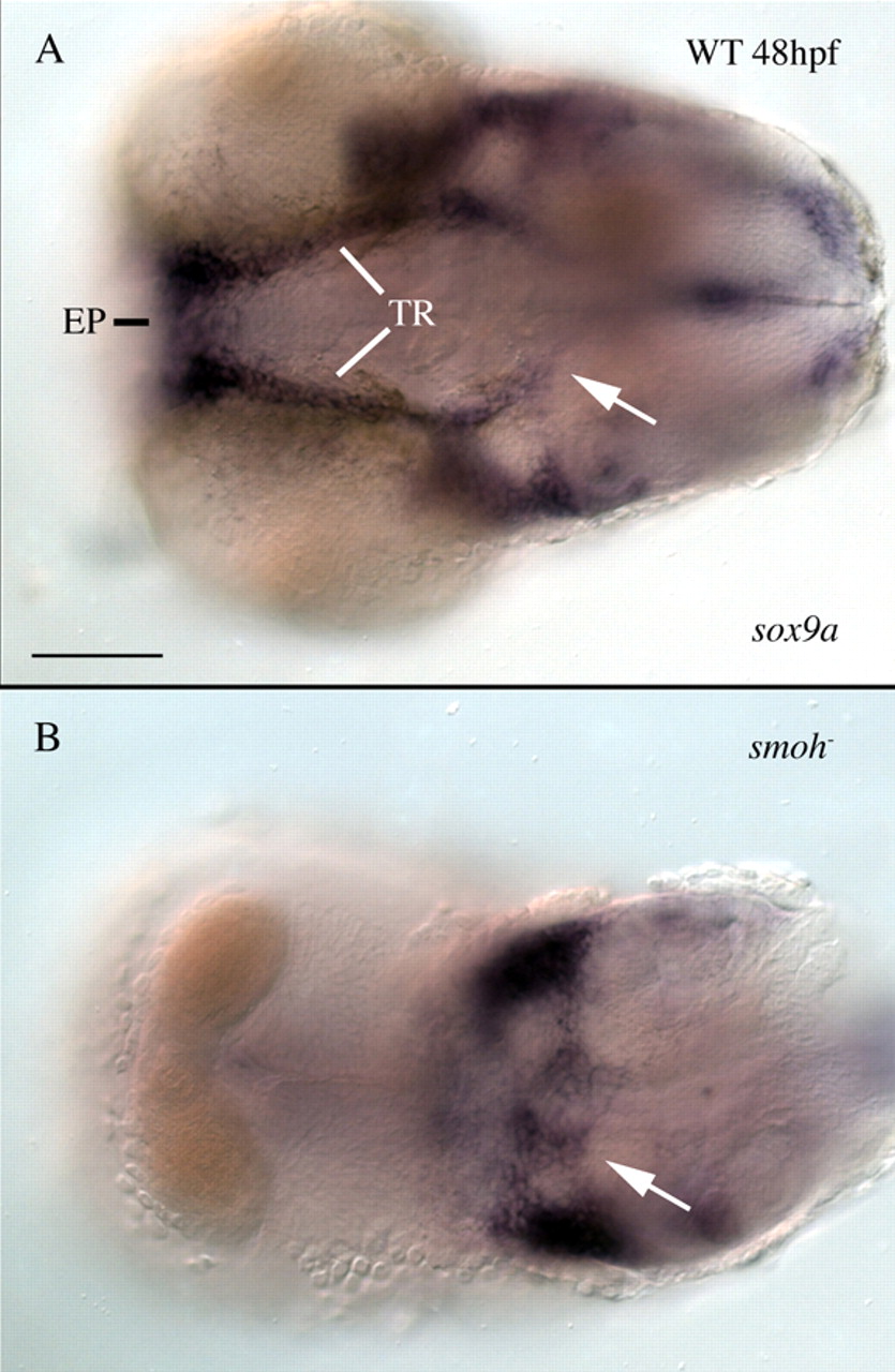 Fig. 2 smo- mutant embryos have no anterior neurocranium precartilage condensations. Embryos were stained with RNA probe to the precartilage marker sox9a, the pharyngeal arches were dissected away from the embryos and ventral views of the neurocranium were imaged. (A) At 48 hpf, sox9a-positive cells prefigure the morphology of the 4 dpf neurocranium in wild-type embryos. (B) Embryos lacking all Hh signaling have a complete loss of anterior neurocranium precartilage condensations; however, immediately posterior precartilage condensations are present (arrows in A,B). EP, ethmoid plate; TR, trabeculae; WT, wild type. Anterior is leftwards. Scale bar: 50 μm.