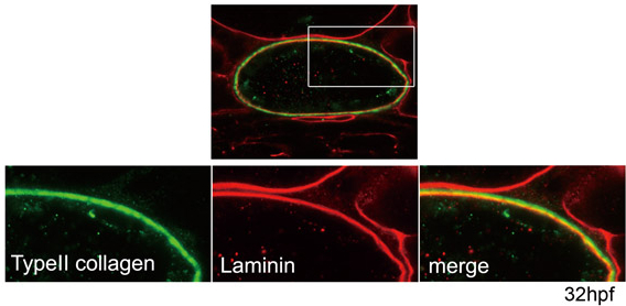 Fig. S8 The medial layer appears to consist of type II collagen. Type II collagen was detected external to the laminin-rich inner layer. The boxed area is enlarged in the lower panels. Green, type II collagen; red, laminin; yellow, merged expression of type II collagen and laminin. Transverse sections through the trunk region of an embryo at 32 hpf are shown.