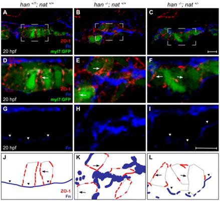 Fig. 4 Tissue architecture and Fn localization improve without rescue of polarity. (A-I) Transverse confocal sections of the right lateral mesoderm in zebrafish embryos expressing Tg(myl7:egfp) (green). Dorsal is up. ZO-1 (red) and Fn (blue) are detected by immunofluorescence. The boxed regions in A-C are shown at higher magnification in D-I. Scale bars: 10 μm. (J-L) Schematics of the cardiomyocyte-associated localization of ZO-1 (red) and Fn (blue) as shown in D-I. Wild-type cardiomyocytes are organized in a cohesive layer (A) and exhibit lateral localization of ZO-1 (D,J, arrows) and basal deposition of Fn (D,G,J, arrowheads). In han embryos, tissue architecture is aberrant (B) and myocardial apicobasal polarity is not evident (E,H,K). ZO-1 is diffuse or absent (E,K, arrows) and Fn deposition is disorganized (E,H,K). In han-/-;nat+/- embryos, myocardial cohesion (C) and basal Fn localization (F,I,L, arrowheads) are improved, but polarity is not consistently rescued: localization of ZO-1 is either lateral or absent (F,L, arrows).