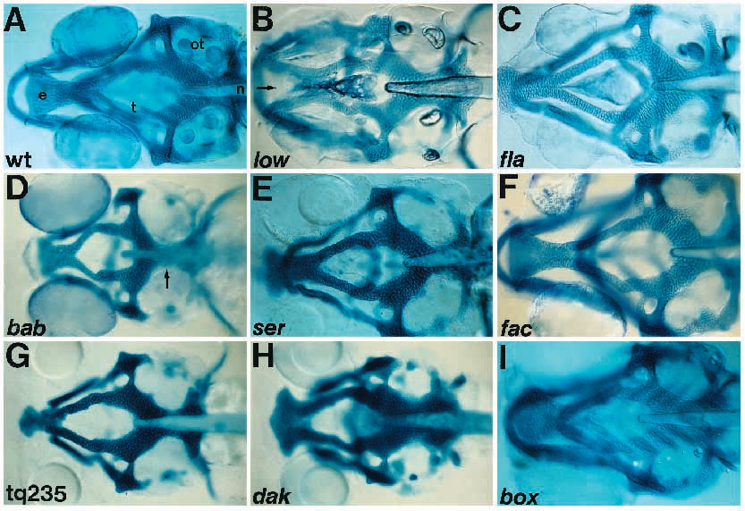 Fig. 5 Skeletal defects in mutants (ventral view; neurocranium). A more dorsal focus of the animals shown in Fig. 4. (A) Wild type, wt. (B) low. The ethmoid plate is split in the midline (arrow). (C) fla. The ethmoid plate is narrow. (D) bab. All cartilages are severely reduced, including parachordal cartilages (arrow). (E) ser. (F) fac. (G) tq235. All cartilages are severely reduced, particularly the ethmoid plate. (H) dak. All cartilages short and thick. (I) box.