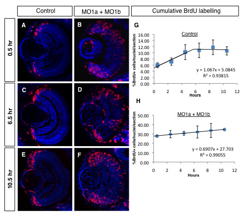 Fig. 8 Cumulative BrdU labelling reveals an increase in the morphant progenitor cell cycle in the 72 hpf retina. (A-F) Immunolabelled coronal sections (dorsal to the top, lens to the left) from embryos repeatedly injected with BrdU (red) after different survival times (indicated on the left). Sections were counter-stained with DAPI (blue). (G, H) Regression analyses from cumulative labelling data. MO, morpholino; hpf, hours post-fertilization, hr, hours.