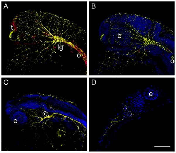 Fig. 3 Neuronal structures were visualized by the Zn12 antibody (Yellow), whereas Prp2 was detected with a rabbit anti serum (Red). A) In the wild type 24 hpf Prp2 is observed in the trigeminal ganglion and telencephalon, but also present in other neuronal tissue. B) Neuronal structures visualized by HNK-1 staining (Zn-12 antibody) in the same specimen as in A. C) Aberrant morphology of the trigeminal ganglion in Prp2 morphants (arrow) as well as reduced number of peripheral neurons visualized by HNK-1 staining. D) Non deconvolved single plane image of a morphant with condensed nuclei (inside stippled ring). Abbreviations: eye (e), telencephalon (t) and trigeminal ganglion (tg).